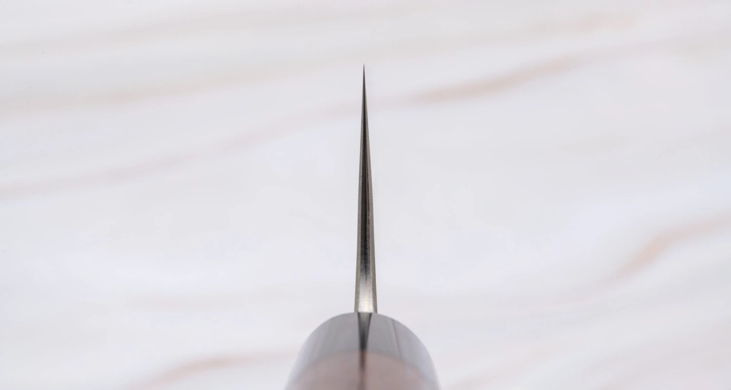 It has a double bevel (symmetrical) blade. Viewed from the back of the blade, the knife is heavier and stronger at the handle and thinner and more precise at the tip. This blade shape makes the knife easier to use because the blade is very responsive, easily maneuverable and nicely balanced. This type of blade design is also called distal taper – you can read more about it in the article on blade geometry. Â