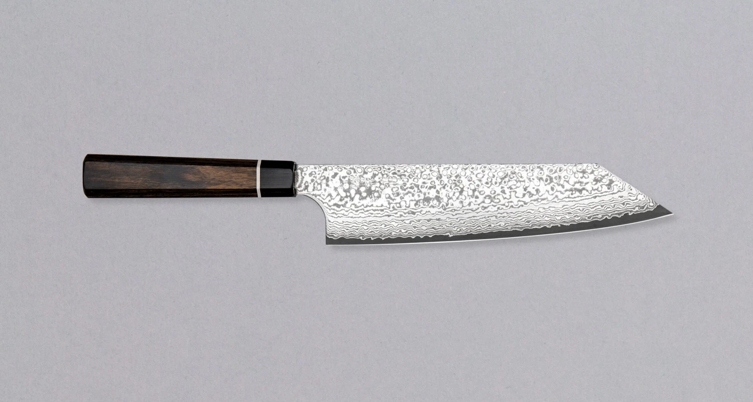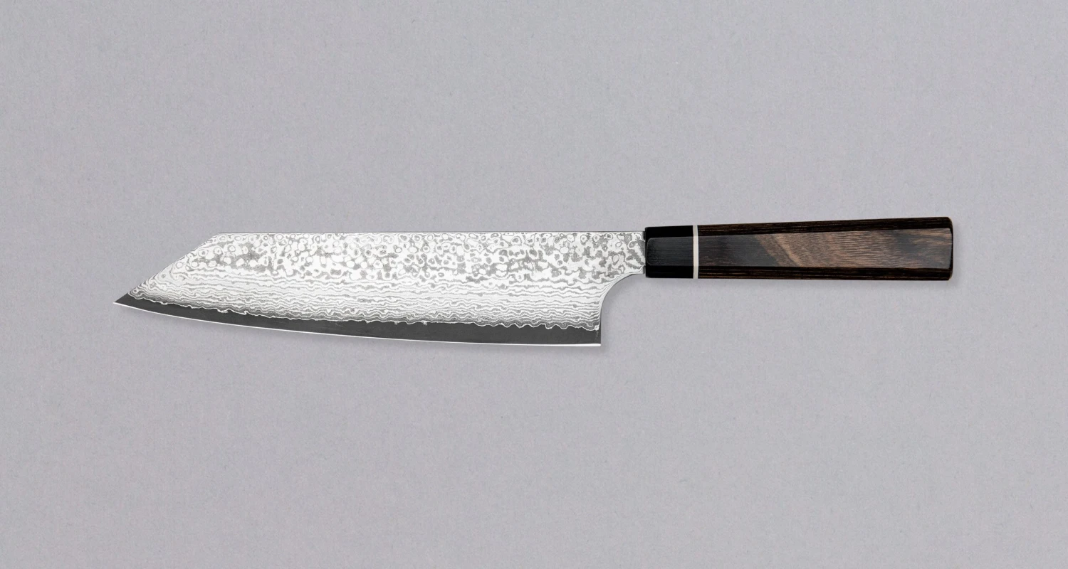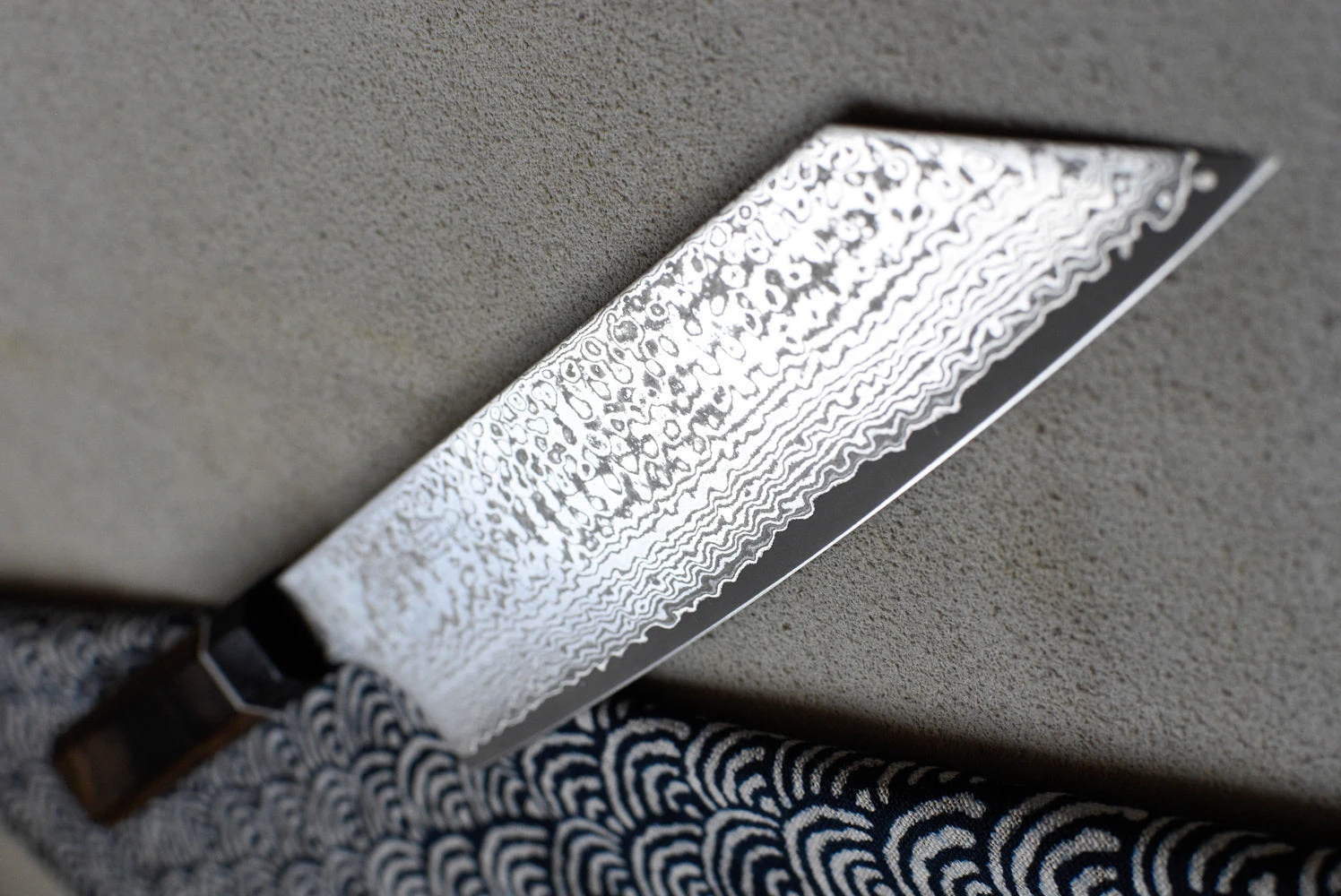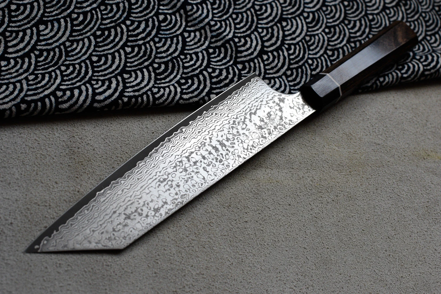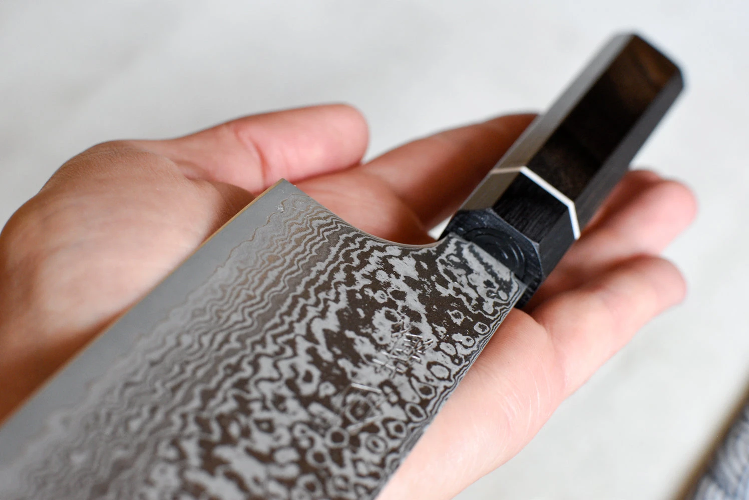 Bunka Black Damascus features a 200mm (7.9″) long blade, clad in what is called Black Damascus. A 33-layer Damascus cladding means every piece has a unique pattern on the blade, making every knife one-of-a-kind.