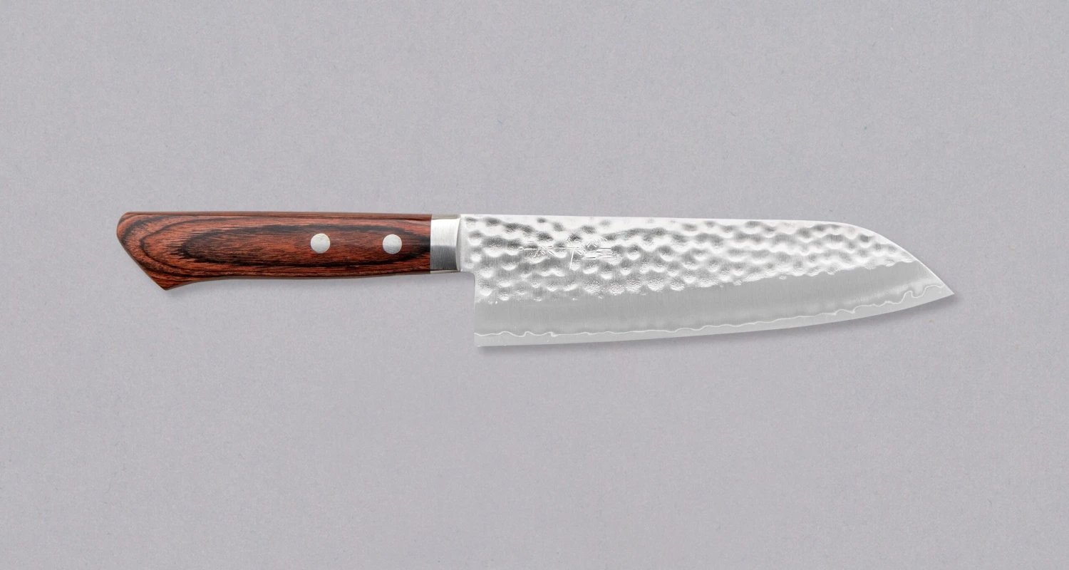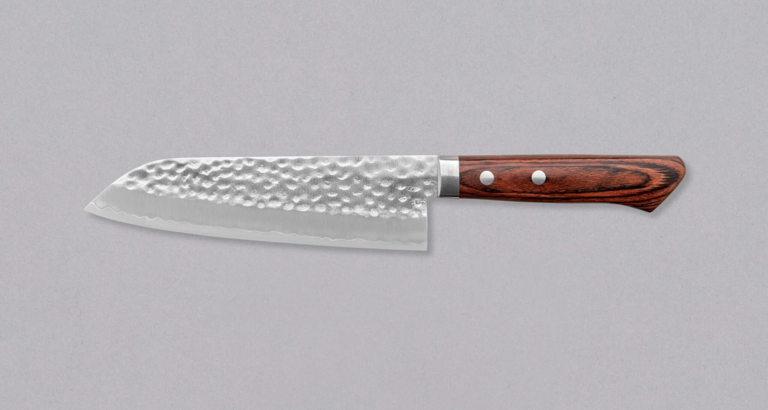 The core of this Santoku is made of VG-1 stainless steel, a younger cousin of more wide-spread VG-10 steel. VG-1 steel is clad into a softer layer of stainless steel, where visible traces of hammer are left to give it a unique look. Compared to VG-10, VG-1 is slightly tougher steel, but with a bit less wear resistance. Due to a very thin grind, VG-1 steel is exposed at the very bottom of the blade (the curvy, hamon-like line). This knife was forged to a hardness of around 60 HRC, which offers a satisfying edge retention and is easy to resharpen.