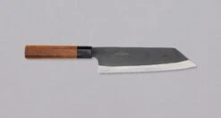 Osamu-san chose a warikomi (also called “split and insert”) method. A glowing hot piece of iron is split and a piece of steel is inserted. The new material is now forged into one piece composed of a very hard steel core in a jacket of two external layers of softer, stainless steel. This creates a highly durable kitchen knife with a slightly more pliable core. The main advantage of these knives is that they are thin, sharp and retain their edge very well.