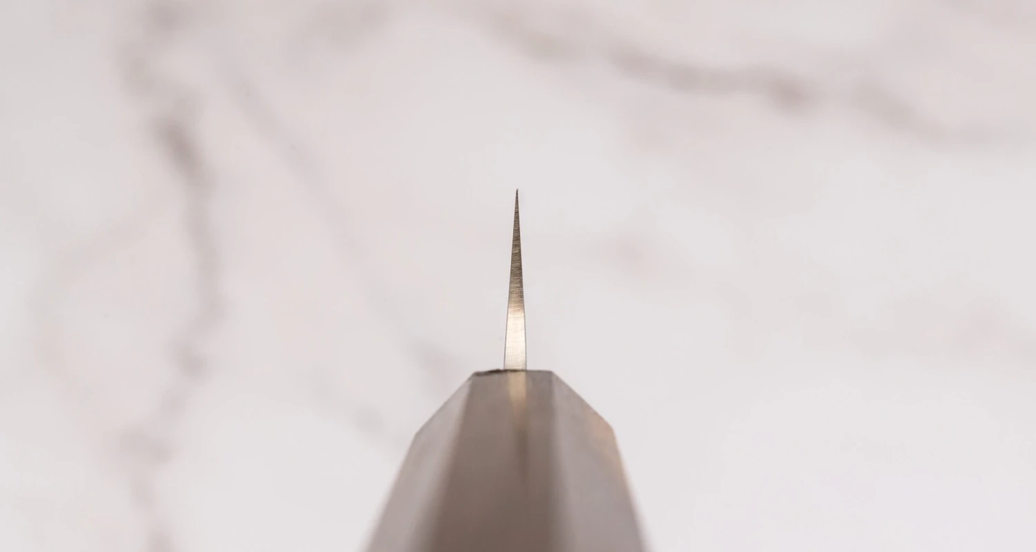 It has a double bevel (symmetrical) blade. The cutting edge is sharpened to a 50/50 angle and stays sharp even after hours of constant use. The blade is extremely thin, which allows the user to work precisely even with the smallest ingredients.