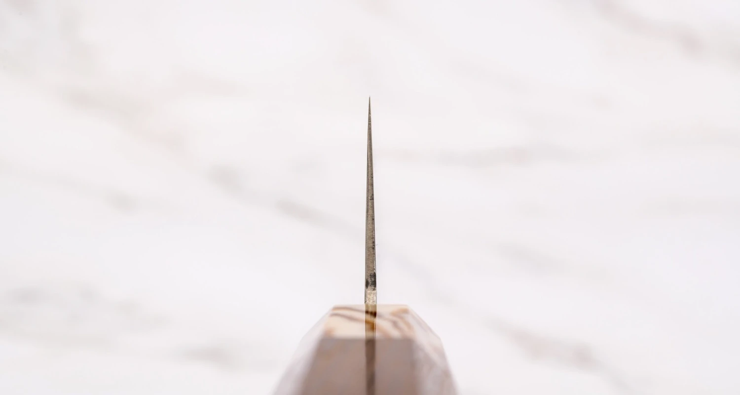 The minimalistic-looking, highly polished (also called migaki finish – see article Blade Construction: Blade Finish for more) blade is extremely thin, which allows the user to work precisely even with the smallest pieces of ingredients.