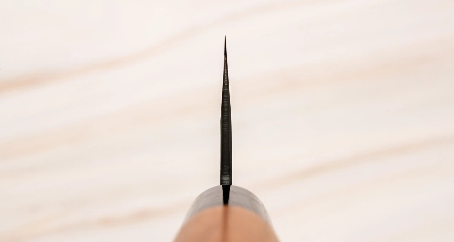 The blade was laminated with soft iron, which is iron with only a small amount of carbon added to it. Laminating the blade improves its structural integrity, as the knife’s core is made of hard—and therefore brittle—high-carbon Shirogami #1 steel that is prone to breakage on its own.