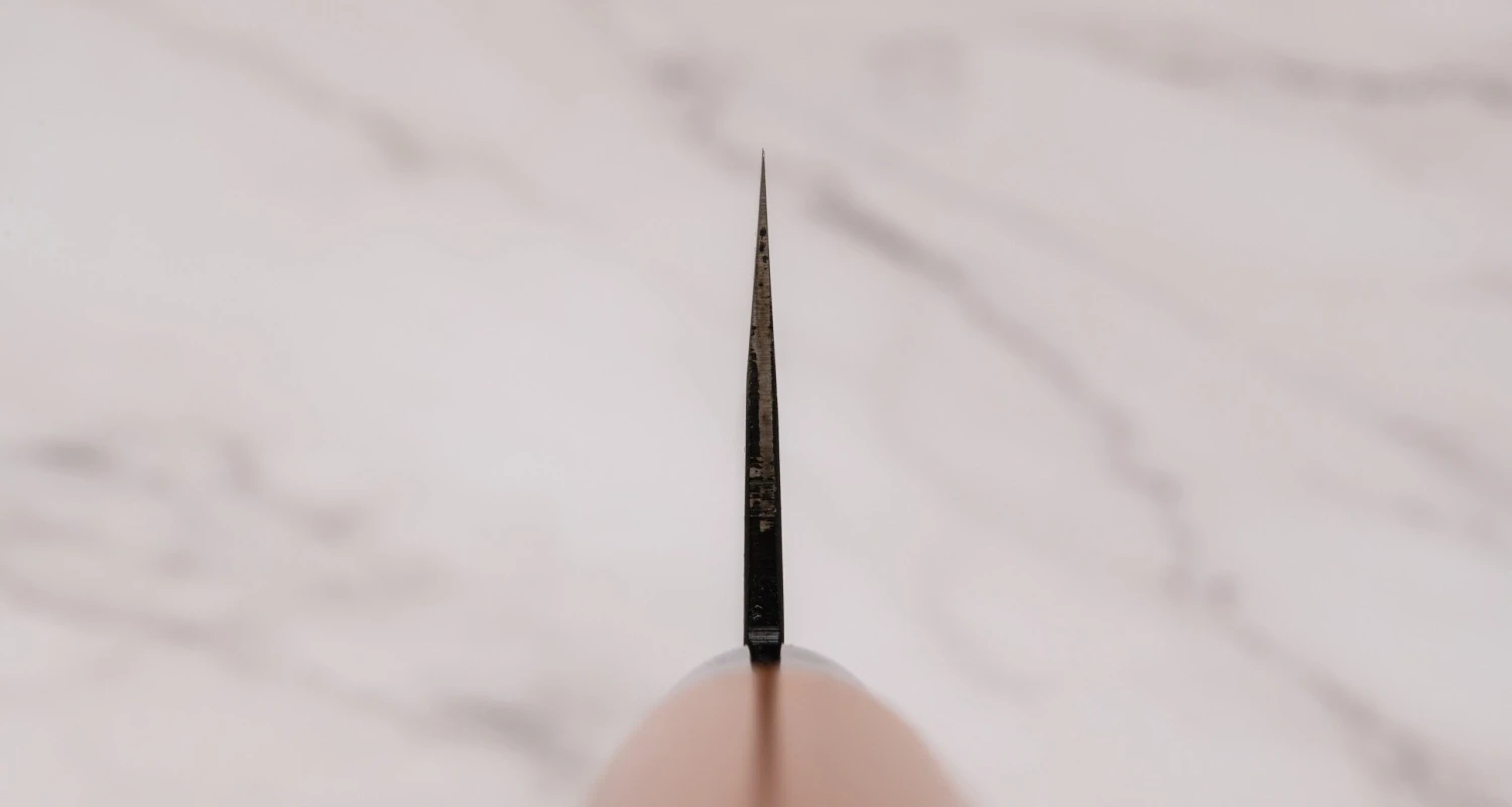 The blade was laminated with soft iron, which is iron with only a small amount of carbon added to it. Laminating the blade improves its structural integrity, as the knife’s core is made of hard—and therefore brittle—high-carbon Shirogami #1 steel that is prone to breakage on its own.