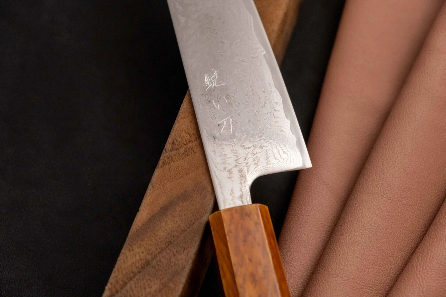 At the very edge, one can spot a pronounced, curvy line (matte finish) that travels along the entire length of the blade. This is the line between the core and the 33 softer, outer layers of steel that serve as additional protection of the core steel. Such a sandwich of the harder core steel and softer outer steel layers is called san-maiย clad. Most of today’s Japanese knives are made this way.