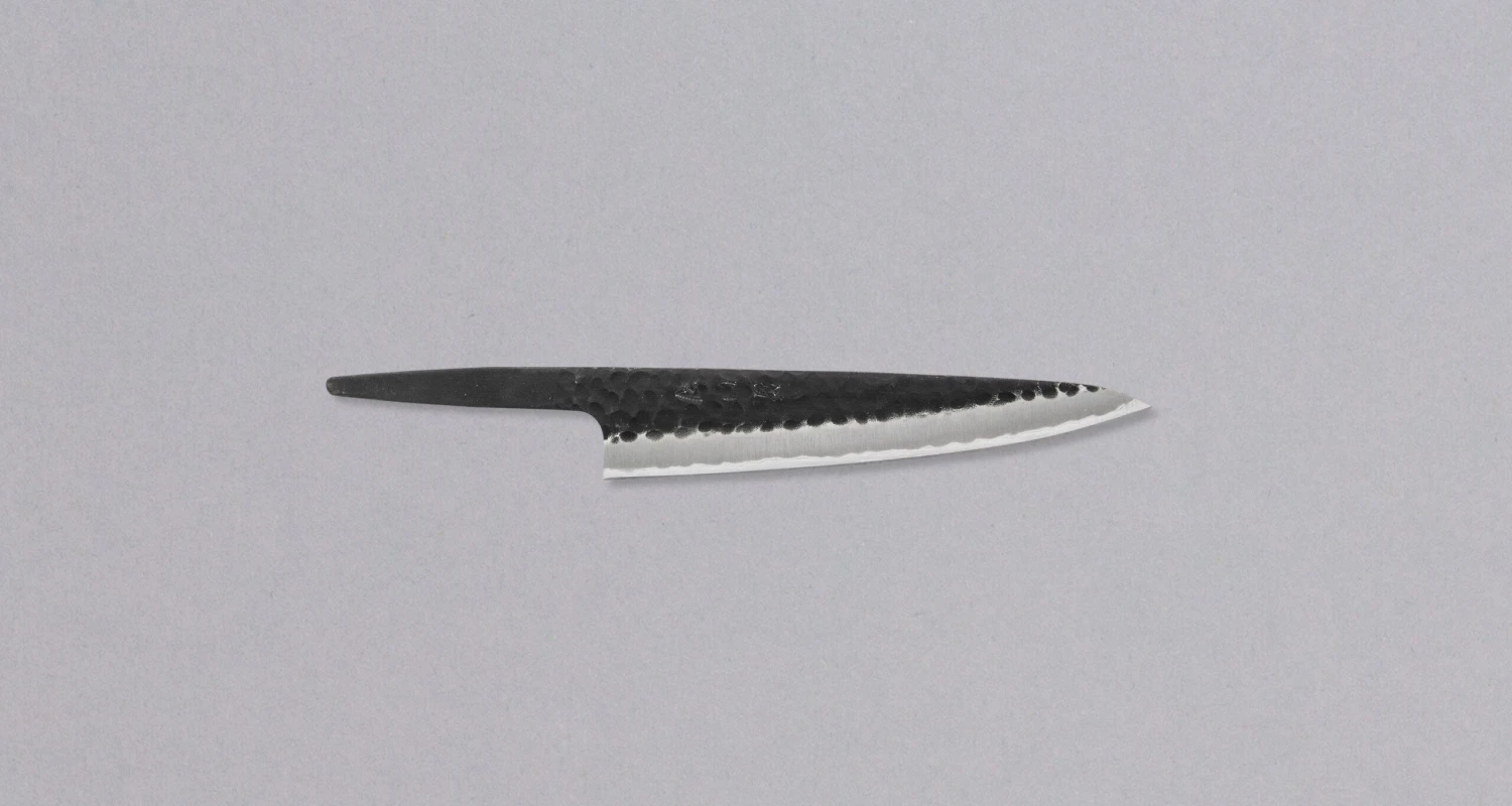 Hokiyama Petty Kuro-uchi 135mm (5.3″) is a great versatile knife with a black Kuro-uchi protective patina and hammer dents, which gives it a unique and rustic appearance. The petty blade shape is a smaller version of a Gyuto knife (Chef’s knife), which makes it a must-have knife in every kitchen,