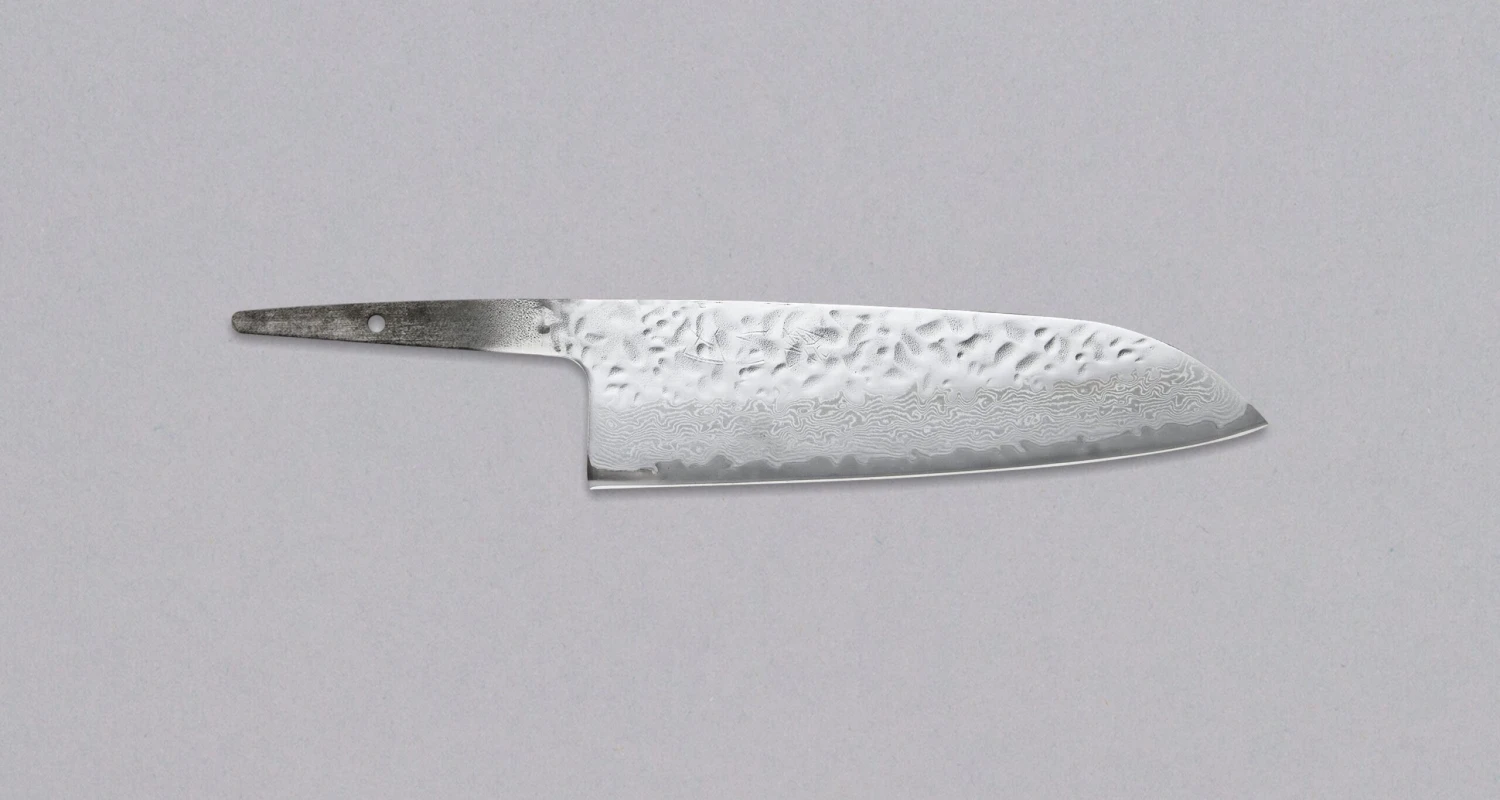 The knife features a beautiful combination of tsuchime and damascus pattern. The upper part of the blade features a hand chiseled kanji and hammer dents (or tsuchime), which then transform into an intricate damascus pattern that flows down to the cutting edge.
