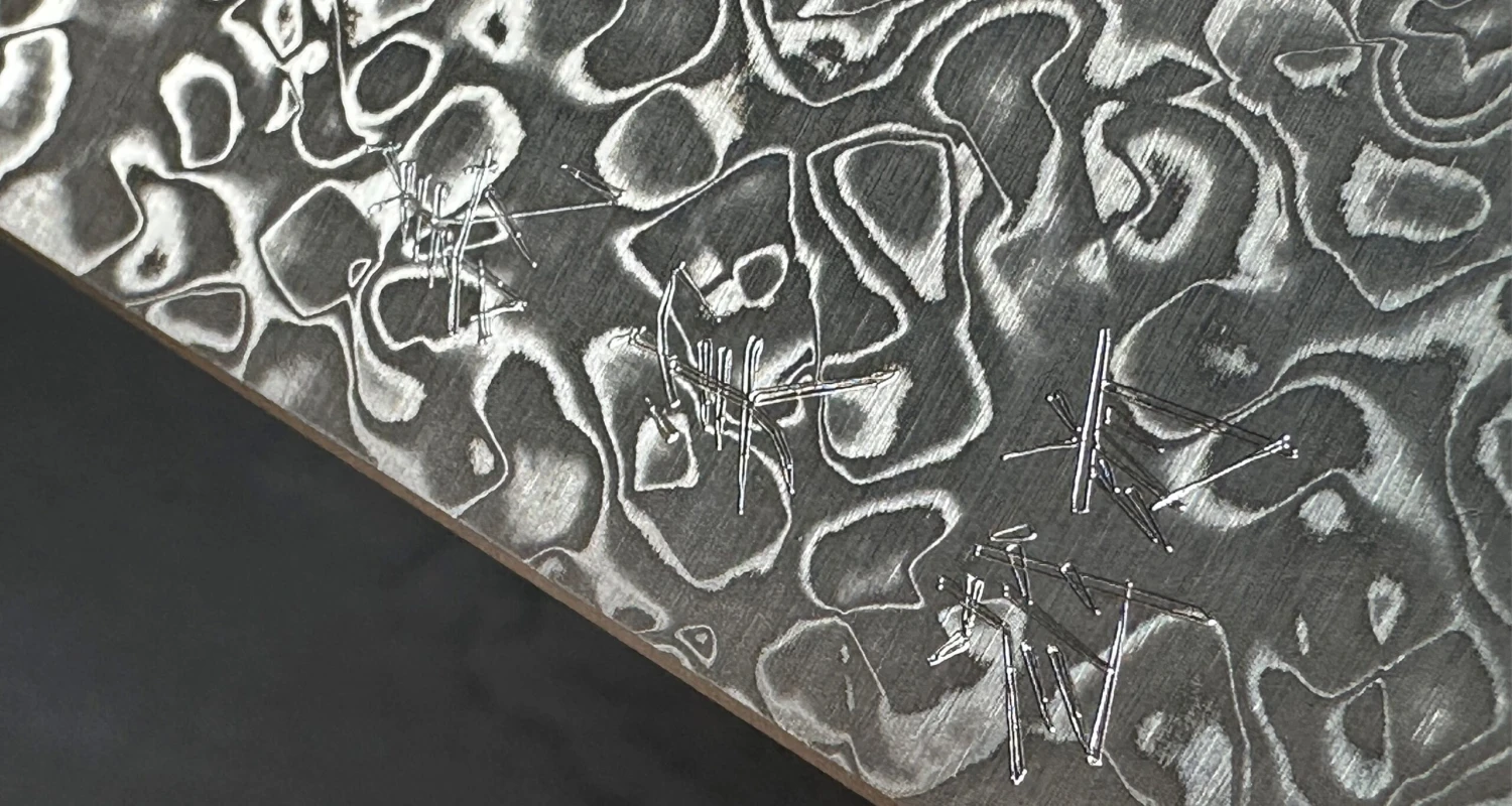 The core of this knife is made of VG-10 steel, a popular, low maintenance stainless steel with good edge retention, hardened to around 60-61 HRC. Softer, nickel (Ni) based steel is clad around the core (san-mai clad), giving the blade this beautiful Damascus pattern.