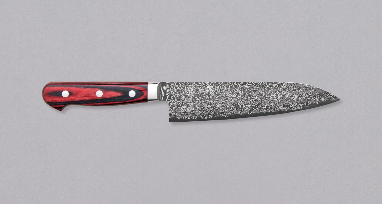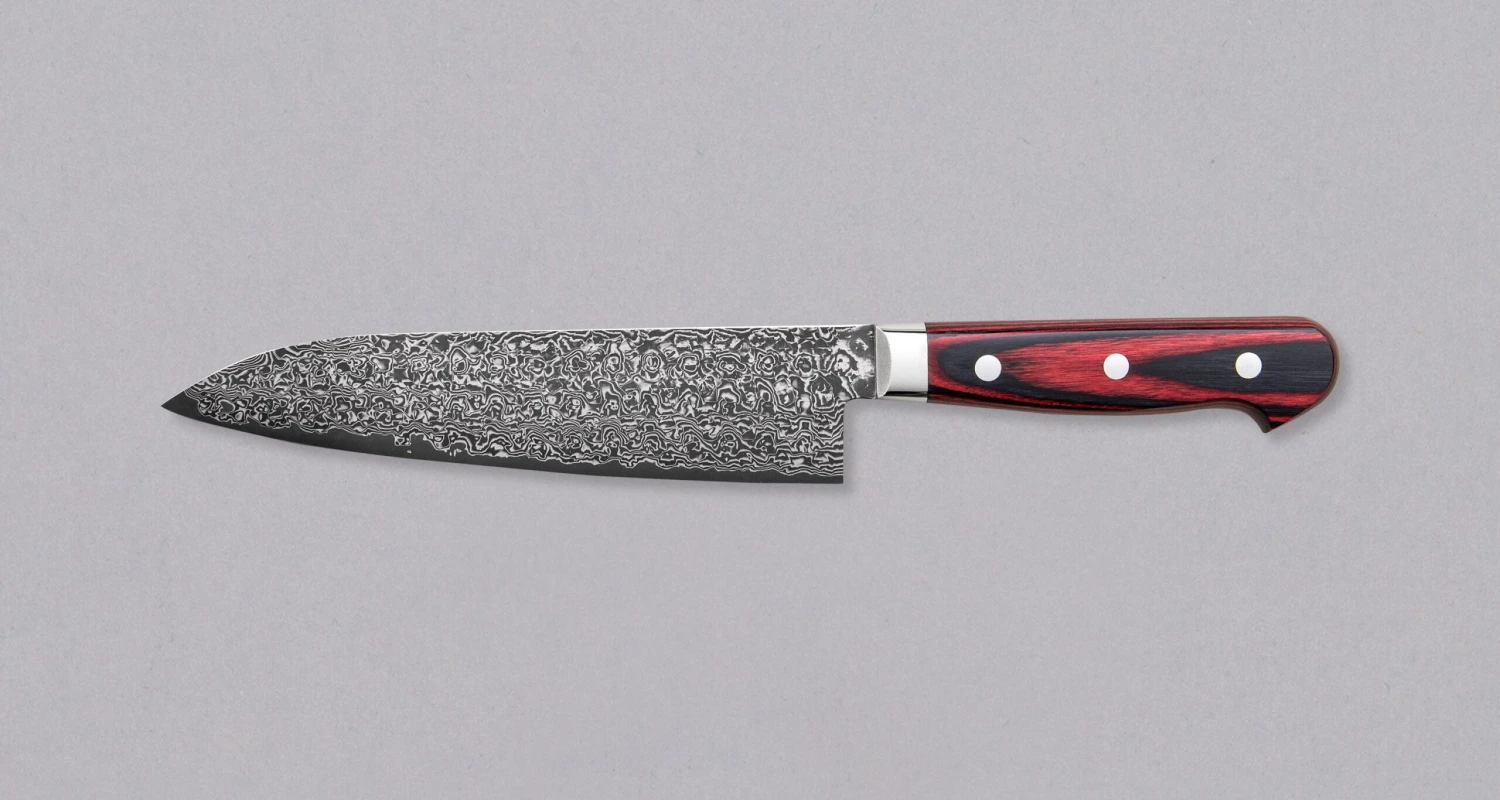 Yoshimi Kato, a relatively young blacksmith from the famous Takefu village, known for many skilled blacksmiths, gave the blade a Western-type, durable red&black pakka wood handle. The handle was attached to the blade with three stainless pins and features a stainless bolster for a smooth transition from the handle to the blade.