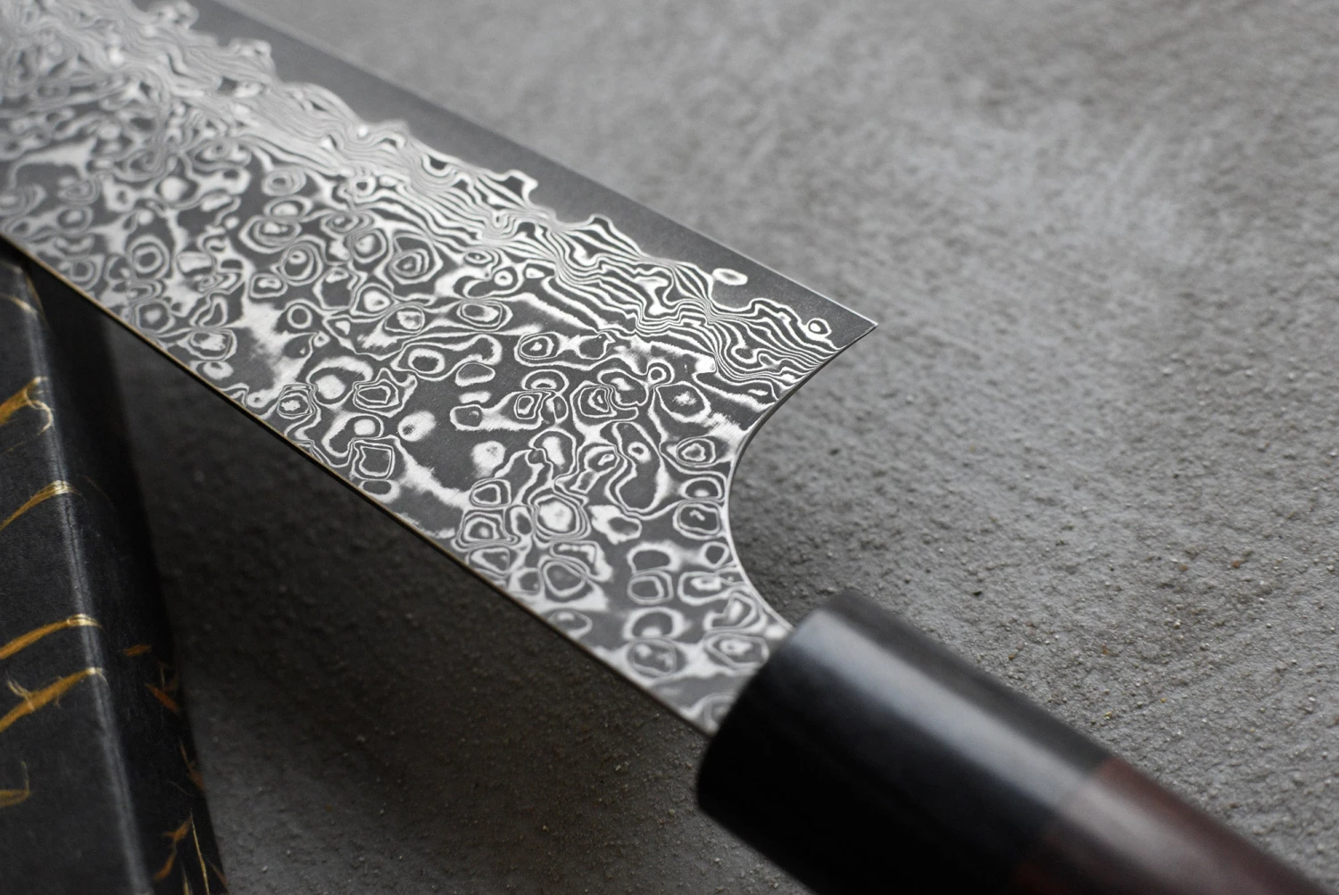 The hypnotic Suminagashi pattern and perfect blade profile left us speechless at first glance at this very special knife. Suminagashi (“floating ink“) is a term for a marbled pattern (called Damascus in knives), made by Yoshimi Kato in this gyuto.