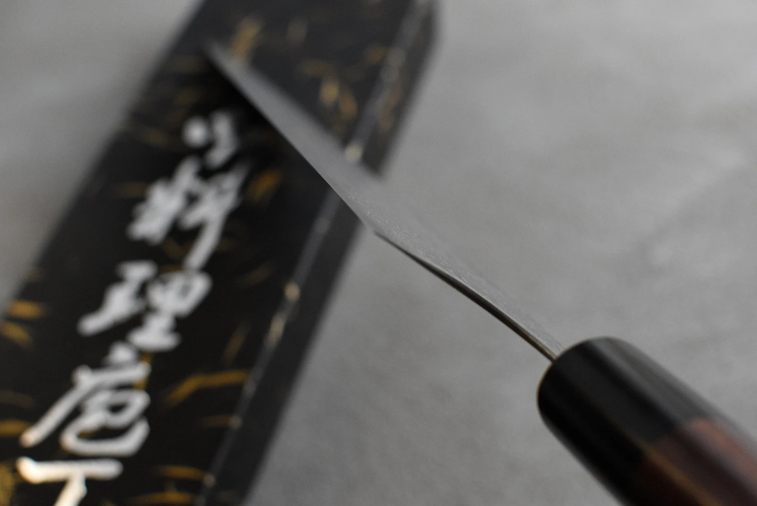The traditional Japanese (Wa) handle is made of rosewood and due to its symmetric oval shape fits perfectly in the left as well as the right palm. The distribution of weight between the handle and the blade makes it extremely comfortable to work with and easy to handle.