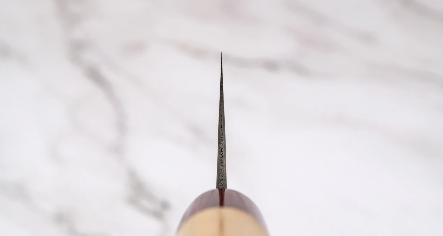 The shape of the blade is called bunka which means culture in Japanese. Bunka makes for a highly versatile knife suitable for cutting vegetables, meat, and fish. The blade is wide and flat at the handle, has a softly curved belly of the blade, suitable for both long and short cuts, and a pointy reverse tanto tip for precise cuts and carvings. The angle of the spine rapidly changes to meet the tip which is referred to as a »K-Tip«. Besides looking badass, this shape allows the user precision and makes getting to the hard-to-get-places a bit easier.