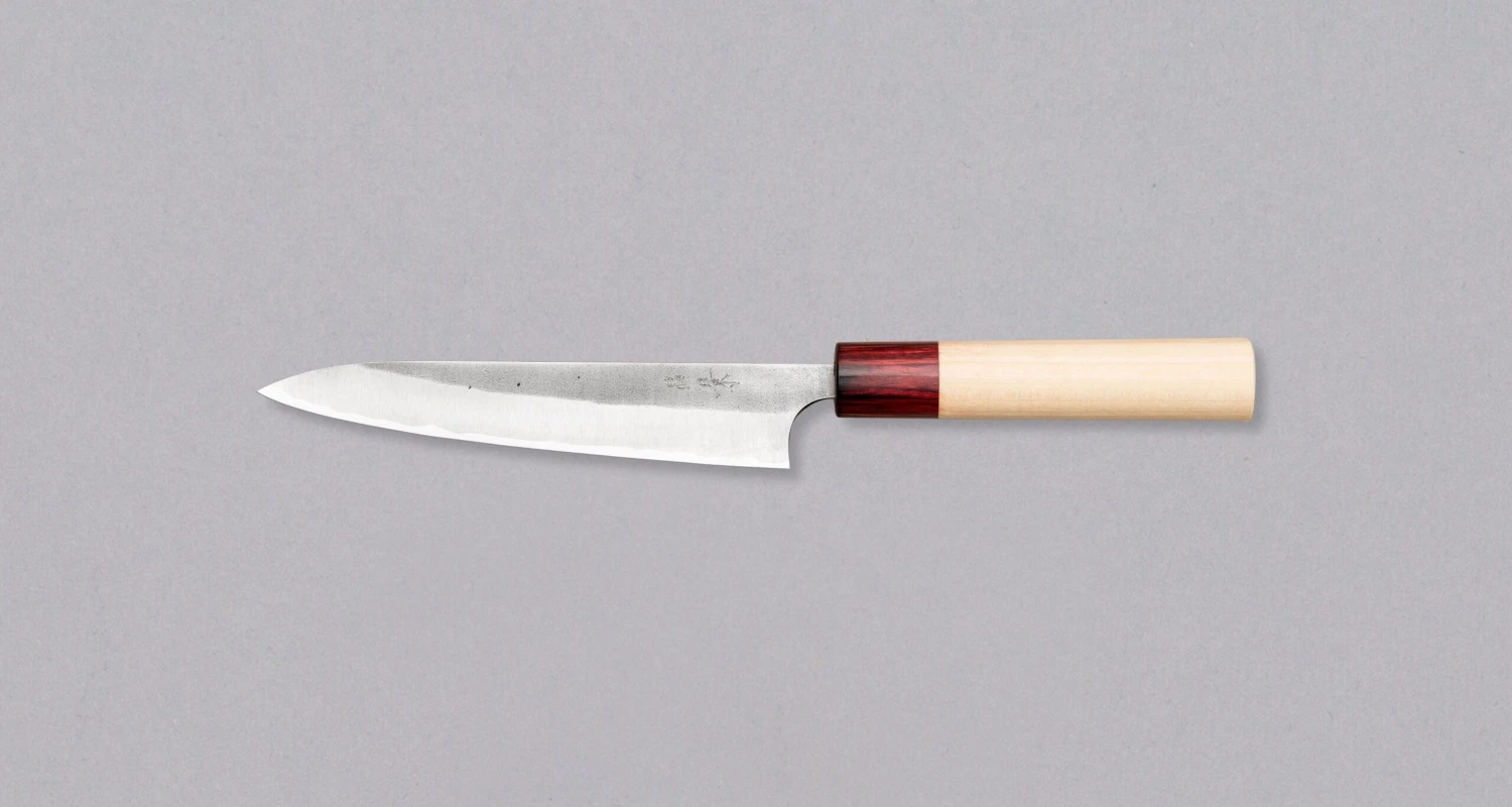 Kato Yuki Petty 150mm (5.9″) blade is essentially a smaller version of a Gyuto knife (Chef’s knife). Petty knives are intended for all those smaller tasks where larger knives are deemed unwieldy, both on and off the cutting board. A must-have knife in every kitchen, it can be used for peeling, mincing, paring, and decorating food.