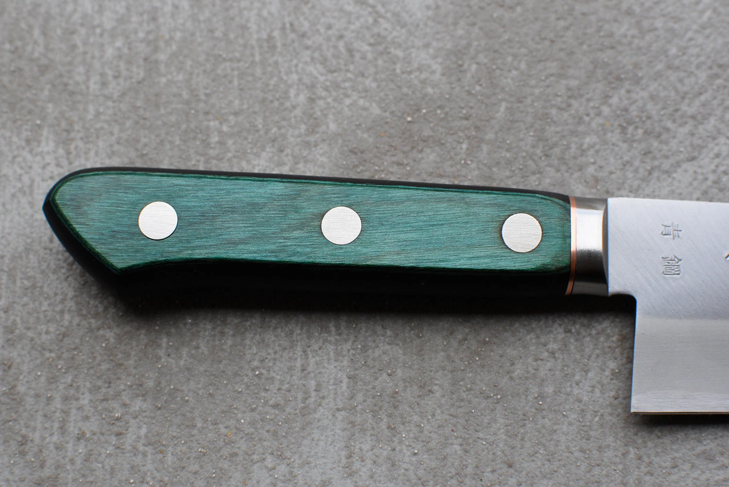 The not-so-common feature is the color of the pakka wood handle. Emerald green is not a choice many Japanese blacksmiths decide fitting on their knives, but we feel it was a good choice. The knife definitely stands out, but not in a flashy way.