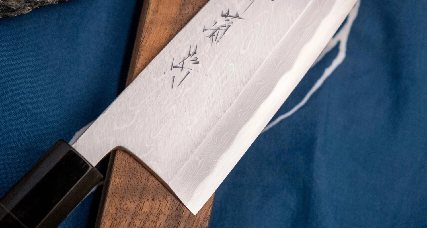The front surface of the blade is adorned with a hand-chiseled kanji, while the uraoshi side bears the mark of the core steel and a wavy line denoting the border between the hagane and jigane. This cladding line can only be done by an experienced blacksmith.