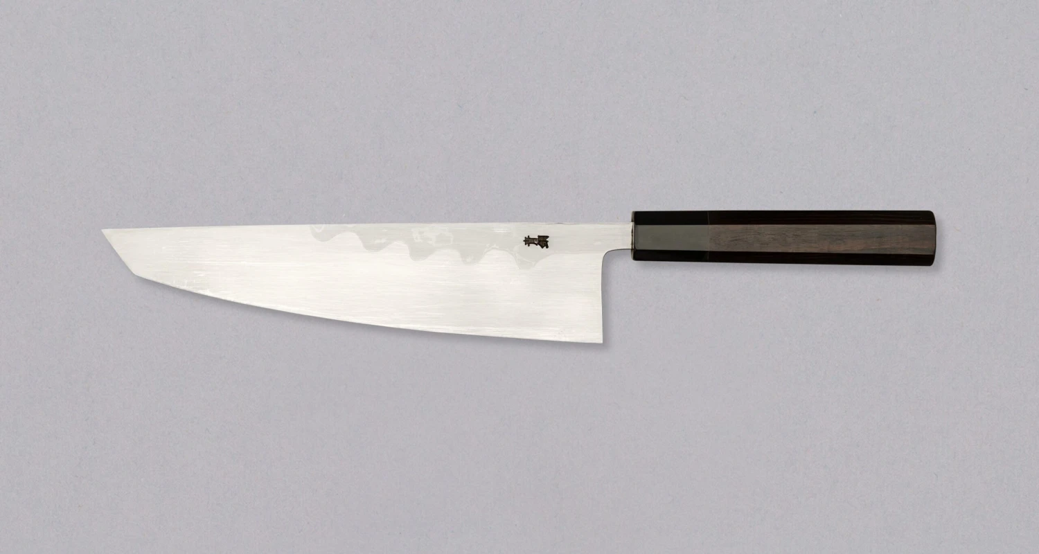 While this knife may not be the star player of the food prep team, it is however the perfect love-child of the single-bevel knife shapes. Its wide profile, similar to that of an usuba or a deba, gives it all the makings of a chef’s go-to knife for precise and complex techniques, like the julienne or the Japanese katsuramuki. Despite the age-old saying, (in the kitchen) size does in fact matter, and the knives listed above usually lack it. This is where the lengthy gyuto really shines – the 220 mm blade is perfect for longer, precise pulling motions used when slicing meat and filleting fish too.