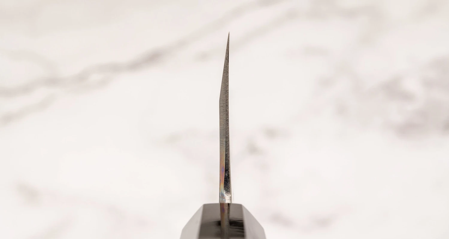 This gyuto differs from others of its kind by two very distinct characteristics. The first one is the grind, and the second is the blade’s unusual shape. The spine is straight and the belly tapers in a continuous curve, until making a sharp turn right before the point. This is where the name sakimaru comes from, it refers to tanto tip.