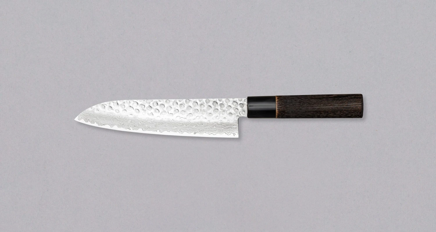 The hand-forged blade is laminated using the san mai method from 45 layers, the core is made out of stainless AUS-10 steel (making maintenance a breeze) and wrapped in layers of Damascus steel. The top part of the blade is adorned with hammer prints (also called tsuchime), which are not just aesthetically pleasing but also prevent the food from sticking to the blade.
