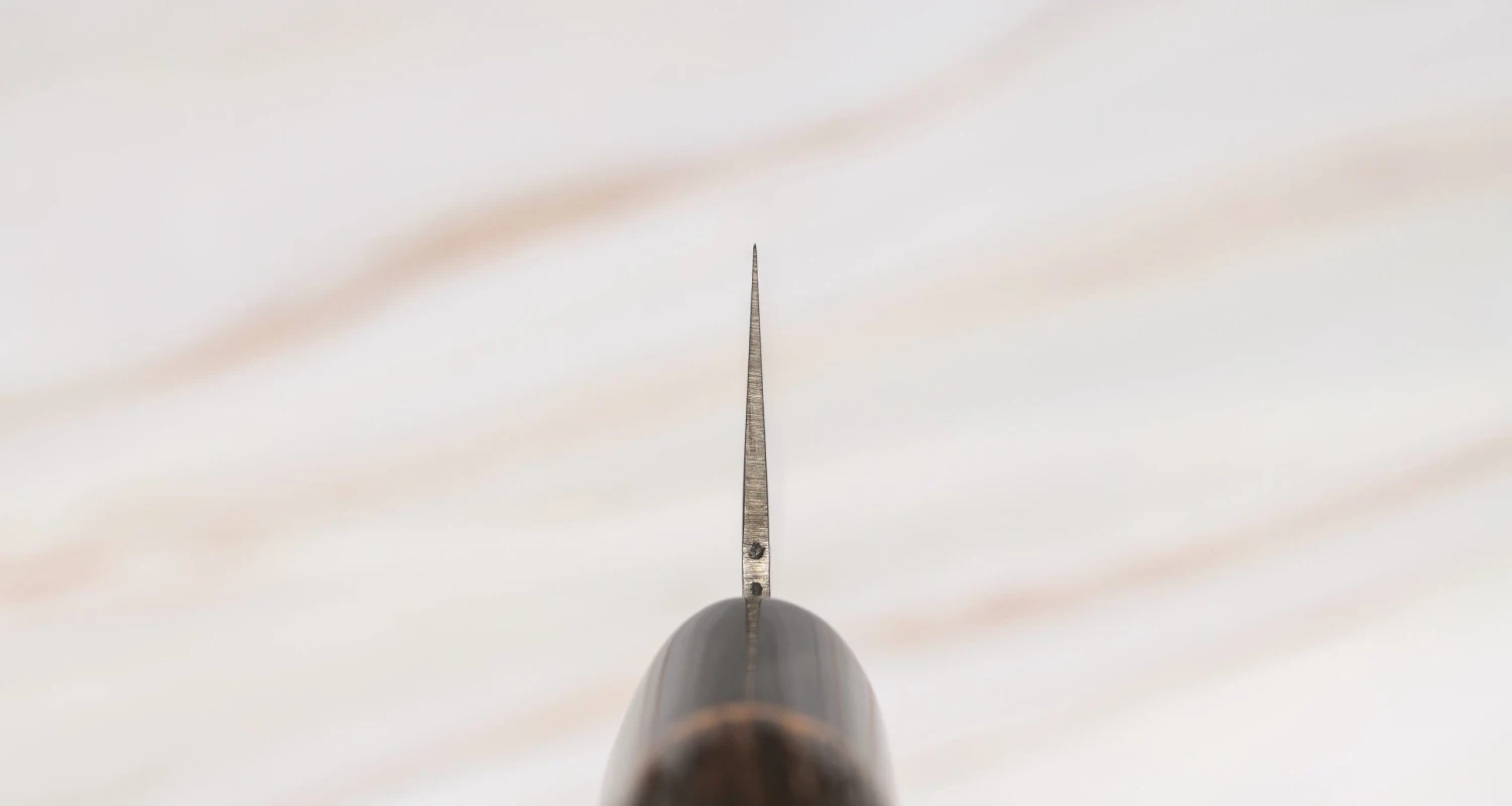 The blade is double bevel (for explanation read this article) and sharpened symmetrically (50/50). It’s fitted with a traditional D-shaped Japanese (wa) handle, made out of burnt chestnut wood with a buffalo horn ferrule, giving the whole knife a bit of a rustic look.
