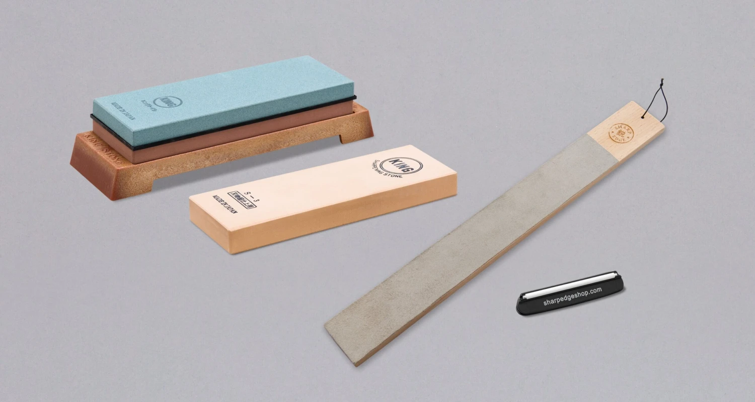 The King “Intermediate” sharpening set is the all-in-one option for slightly more experienced sharpeners, as well as those just starting out. It features every tool needed to give our knife a proper makeover and make it all sharp and pretty again: