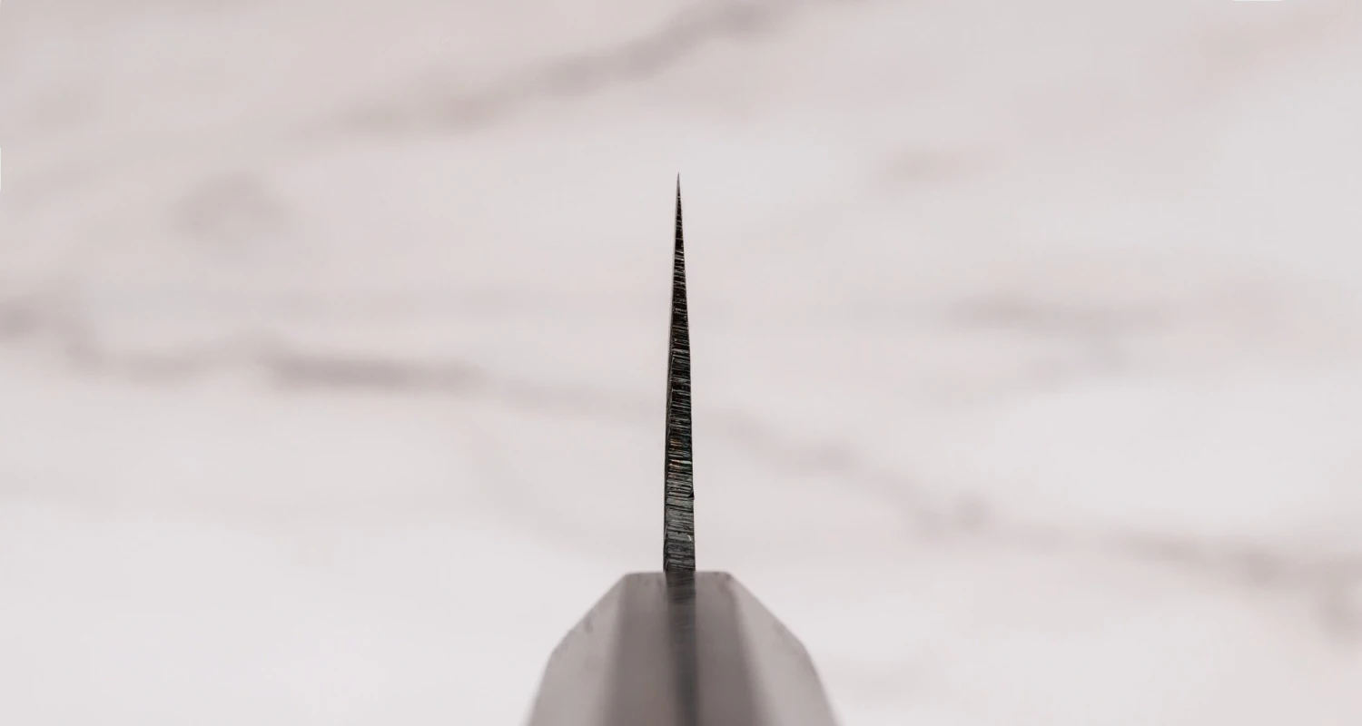 The blade was laminated with soft iron, which is iron with only a small amount of carbon added to it. Laminating the blade improves its structural integrity, as the knife’s core is made of hard—and therefore brittle—high-carbon Aogami #1 steel that is prone to breakage on its own.
