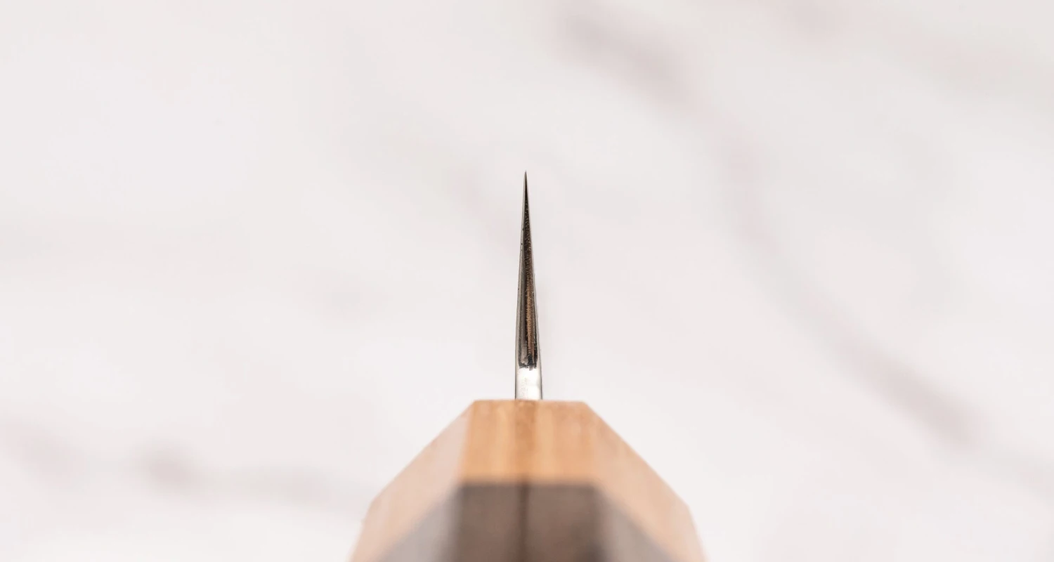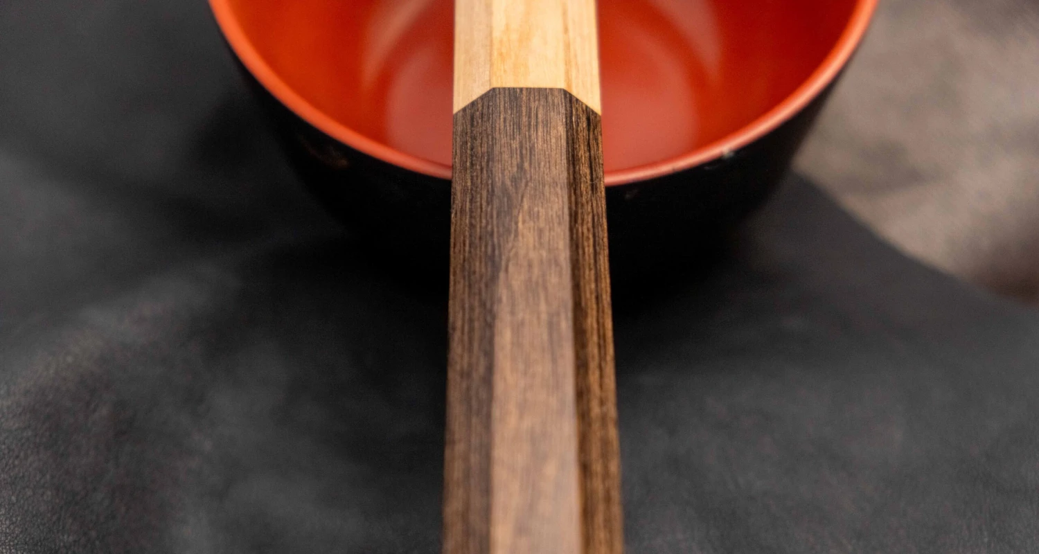 The knife has a classic Japanese handle (wa-style) made of pakka wood. The slightly flattened octagonal shape of the handle helps it align well with the cutting board, and its symmetrical shape makes it suitable for both left- and right-handed users. This handle provides excellent blade control when slicing. Additionally, the compact grip minimizes the possibility of slipping during use.