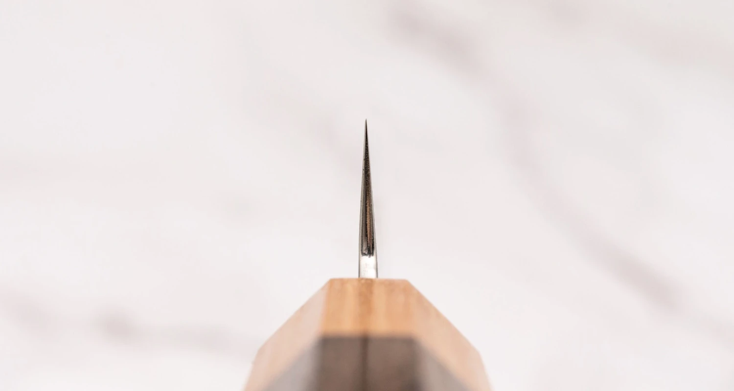 The knife has a classic Japanese handle (wa-style) made of pakka wood. The slightly flattened octagonal shape of the handle helps it align well with the cutting board, and its symmetrical shape makes it suitable for both left- and right-handed users. Its compact and firm grip minimizes the possibility of slipping, which is essential when working with raw fish or meat.