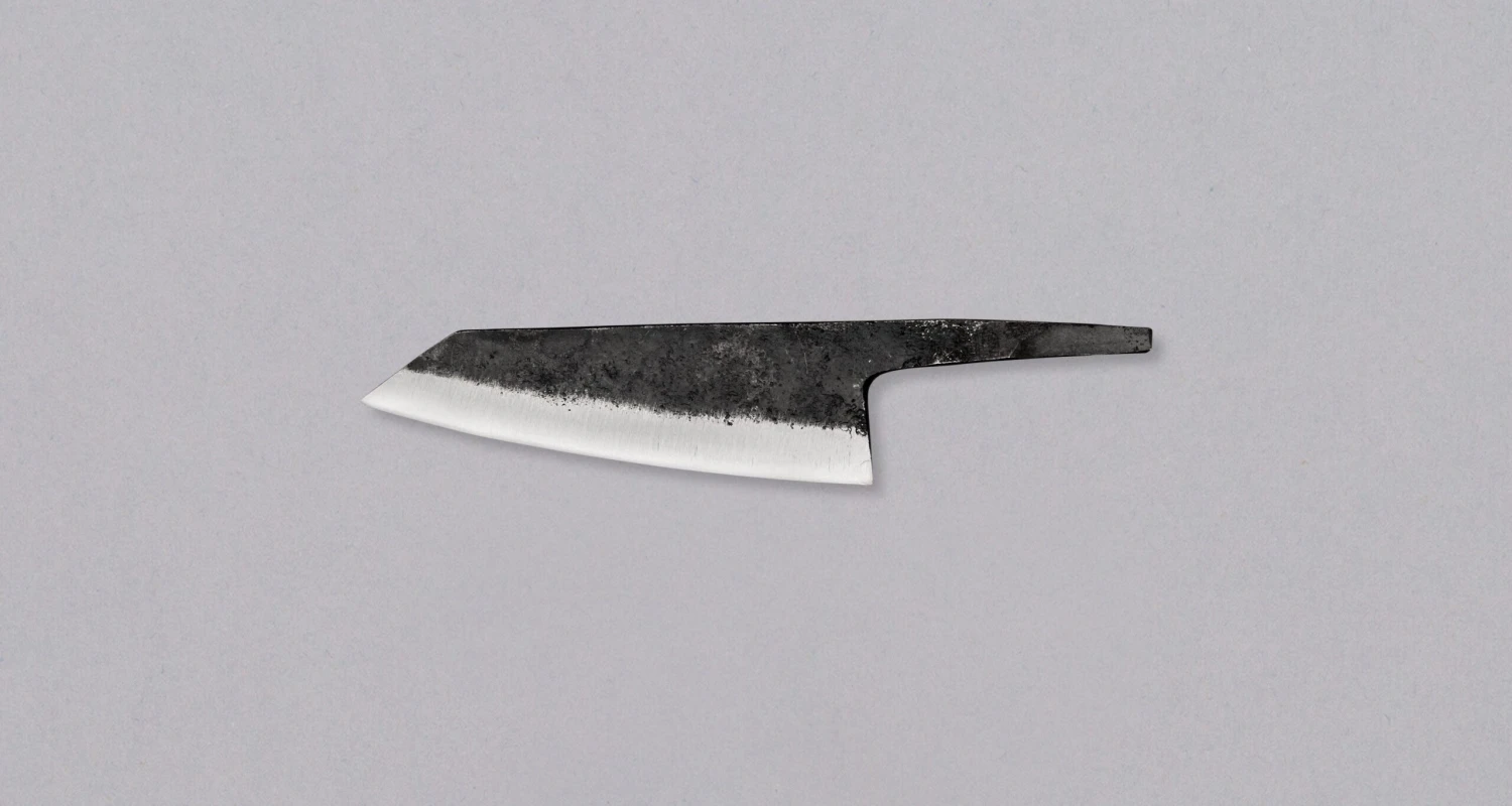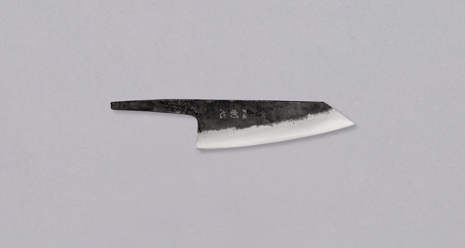 Please Note: The blade finish has a raw, unrefined texture, and since the knife is entirely handmade, small imperfections on the surface are to be expected. Both the core and outer layers are made of carbon steel, which is not corrosion-resistant—so the blade will develop a natural patina over time and may rust if left wet or exposed to acidic substances. This knife is best suited for users familiar with the care and maintenance required for Japanese knives.