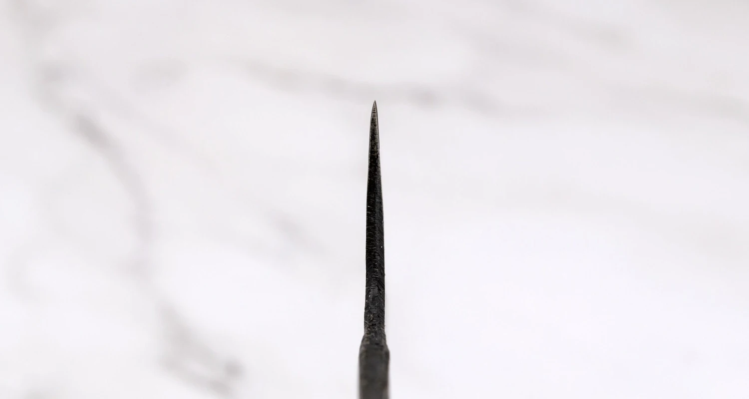The knife has a double-bevel blade with a convex v-edge. It is heavier and stronger at the handle and thinner and more precise at the tip, towards which it tapers. This blade shape makes the knife easier to use because it is very responsive, easily maneuverable, and nicely balanced. This type of blade design is called distal taper – you can read more about it in the article on blade geometry.