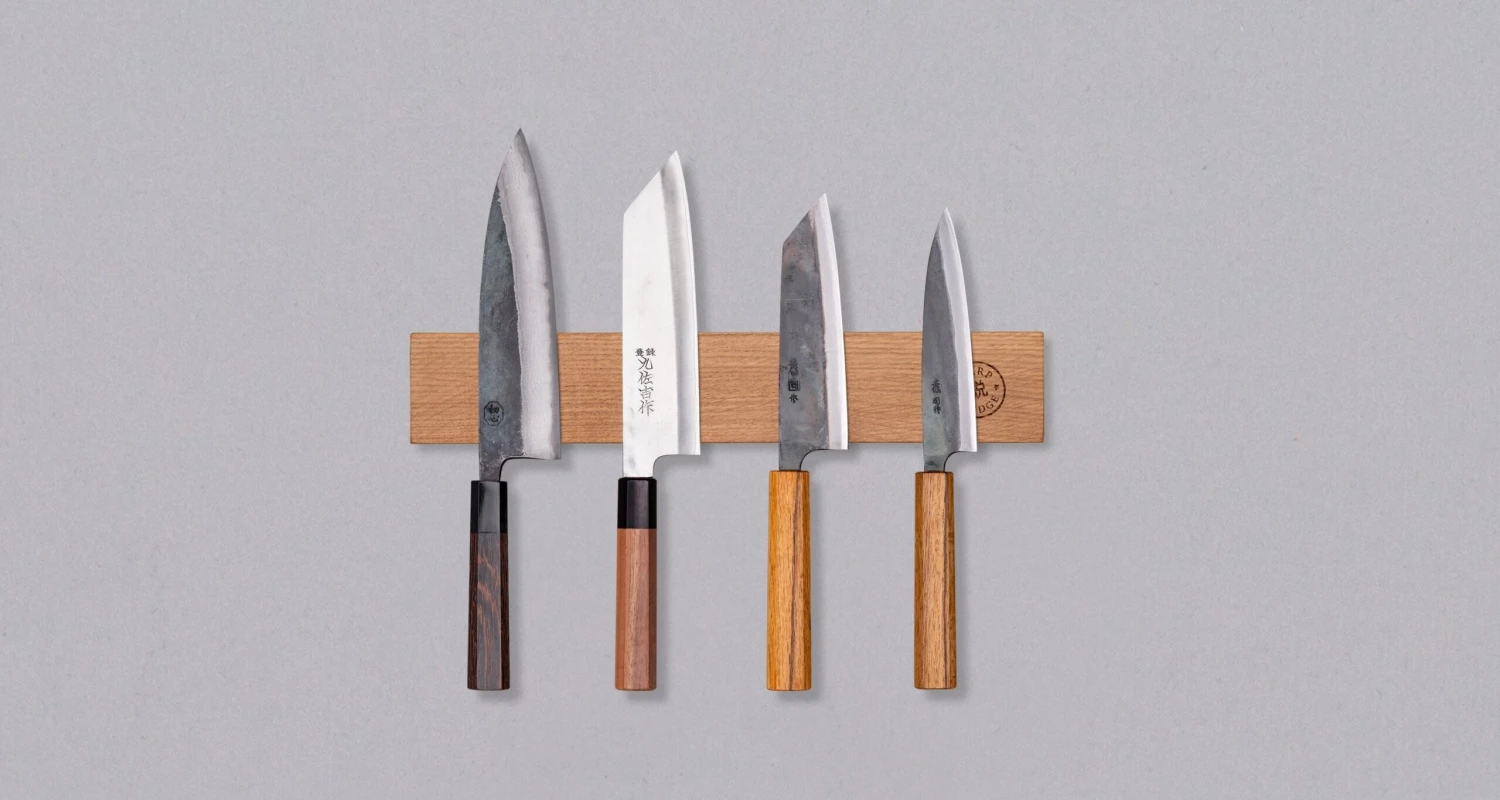 | 🚩 Each knife has two dedicated magnets (placed vertically), as this has proven to be the most convenient and safe way to store even slightly heavier blades, such as deba knives. The distance between the magnets has been carefully thought out to ensure that there is enough space between knives (even if they are wider). Blades won’t hit each other and cause chips or damage (plus your knives will always look organized on it). When placing the knife on the stand, always make sure to place the knife on the magnet with the back of the knife first, and then slowly place the rest of the knife on the magnet. |