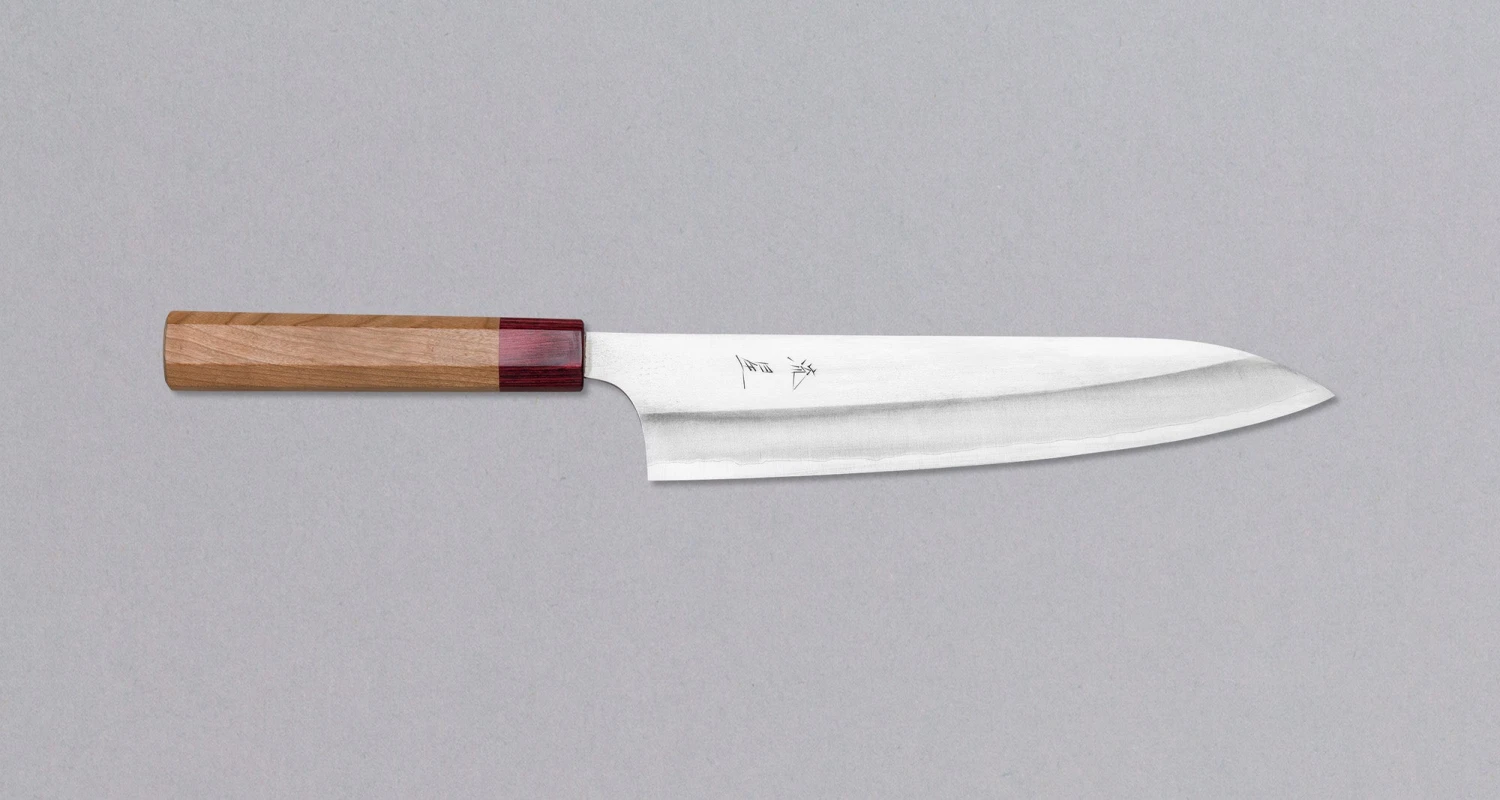 The traditional Japanese (Wa) handle is made of maple and finished off with a red Pakka ferrule. Due to its symmetric octagonal shape, it fits comfortably in the right as well as the left palm.