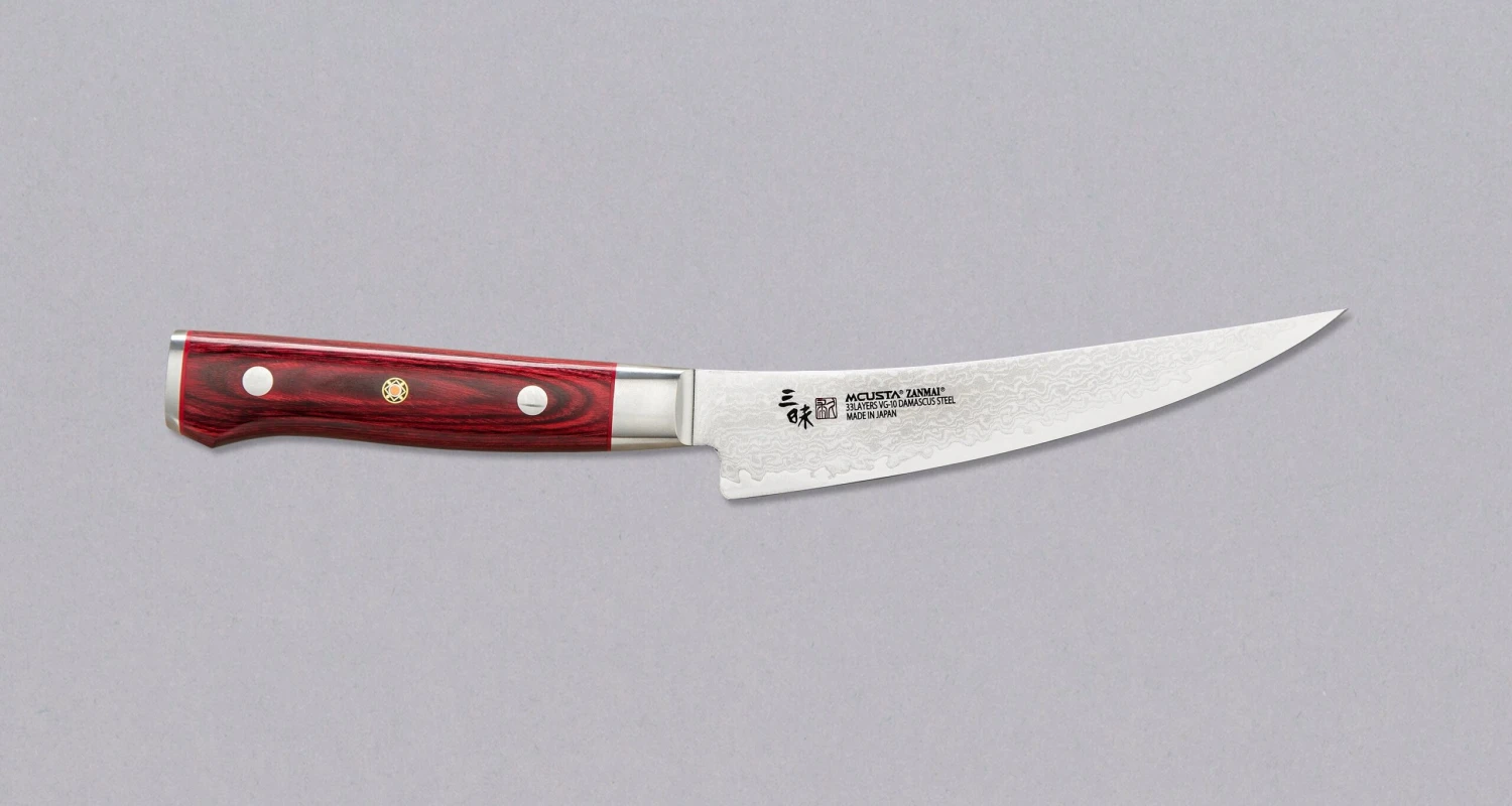 Mcustaย Boning Damascus Flame is a looker. 33 layers of softer and stainless Damascus steel resemble a flame spreading from the bottom to the tip of the blade, giving everyย knife aย unique look. The core of this knife is made ofย great performing, easy to resharpen, VG-10ย steel.