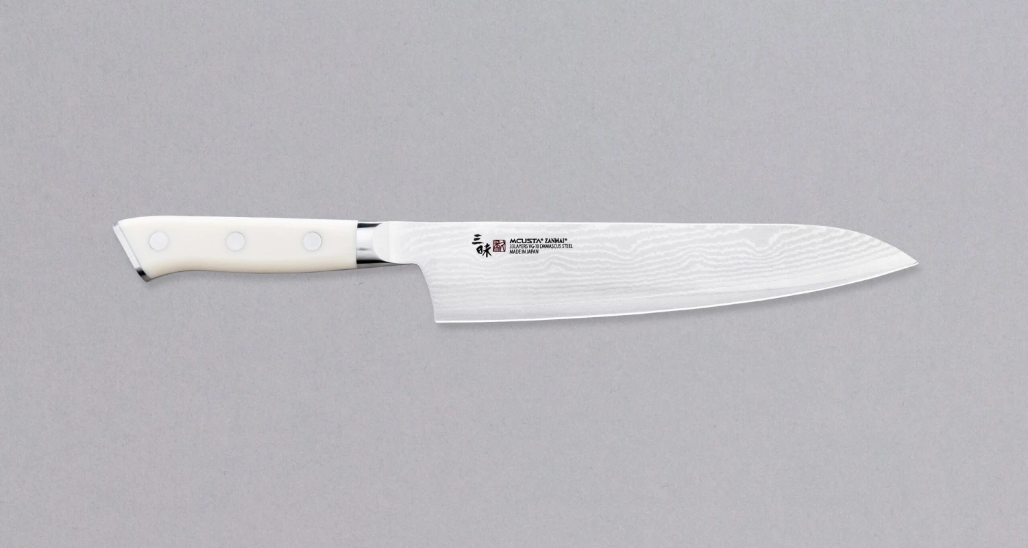 Gyuto blade shape is the Japanese version of the chef’s knife, so this knifeย will fit well into the hands of both the professional chef or the passionate home cook. Withย its thin blade, typical for all Mcusta knives, it willย slice through your veggies, meat, and fish with ease and almost without any applied pressure to the knife.ย