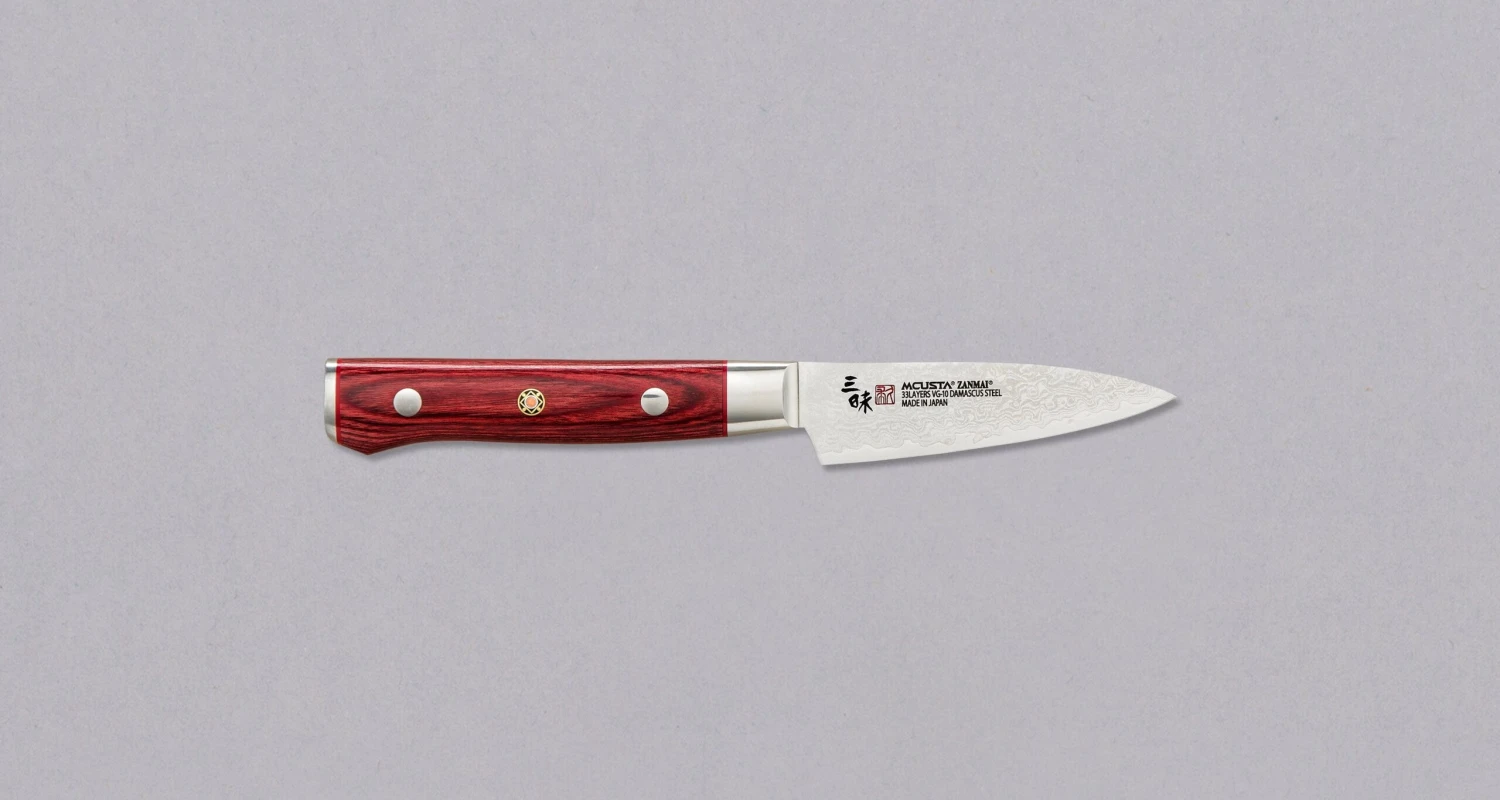 Mcusta Paring Damascus Flame is a looker. 33 layers of softer and stainless Damascus steel resemble a flame spreading from the bottom to the tip of the blade, giving every knife a unique look. The core of this knife is made of great performing, easy to resharpen, VG-10 steel.