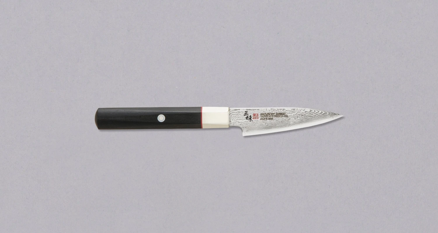 Mcusta Paring Hybrid Splash is another beautiful kitchen knife, cut out from the beams of Mcusta’s lasers, and then sharpened to a razor-edge sharpness by hand. It got its name (Splash) due to the very pronounced Damascus pattern on the blade, making every single blade a unique piece of art, so this knife is a great choice for all the Damascus lovers out there.