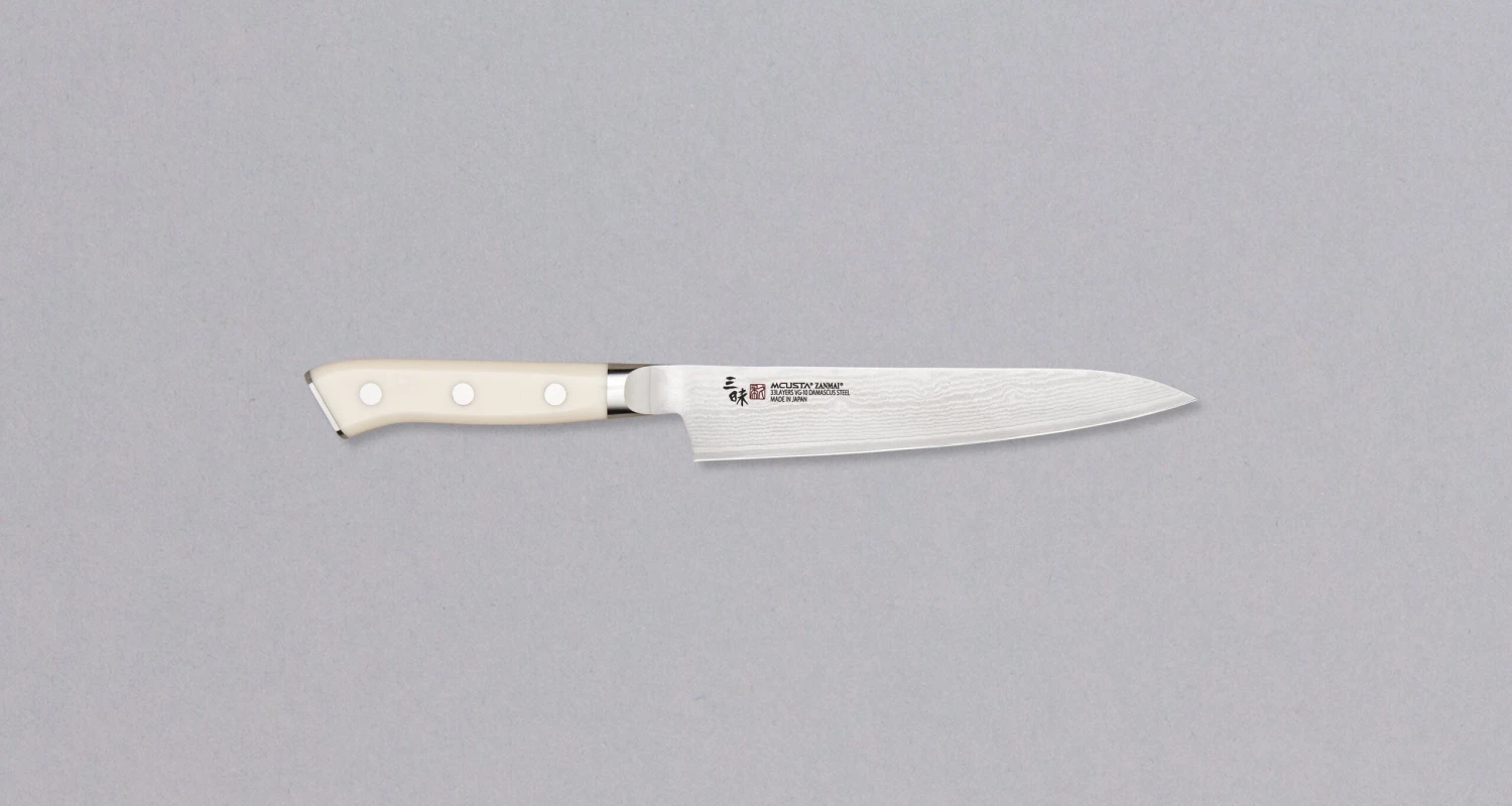Mcusta Petty Damascus Classic D is a great performing kitchen knife, made from the popular VG-10 steel, clad into 33 layers of softer, stainless Damascus steel.