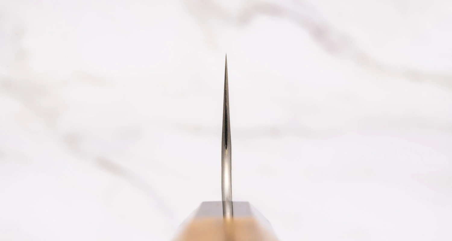 It has a double bevel (symmetrical) blade with convex (full hamaguri) grind. Hamaguri grind allows superior sharpness that requires delicate handling and helps to prevent food from sticking to the blade. Such a shape keeps a lot of metal behind the edge and makes for a stronger edge, yet it still allows a good degree of sharpness. The downside to a convex grind is that it is very hard to reproduce by anyone other than a very experienced sharpener.