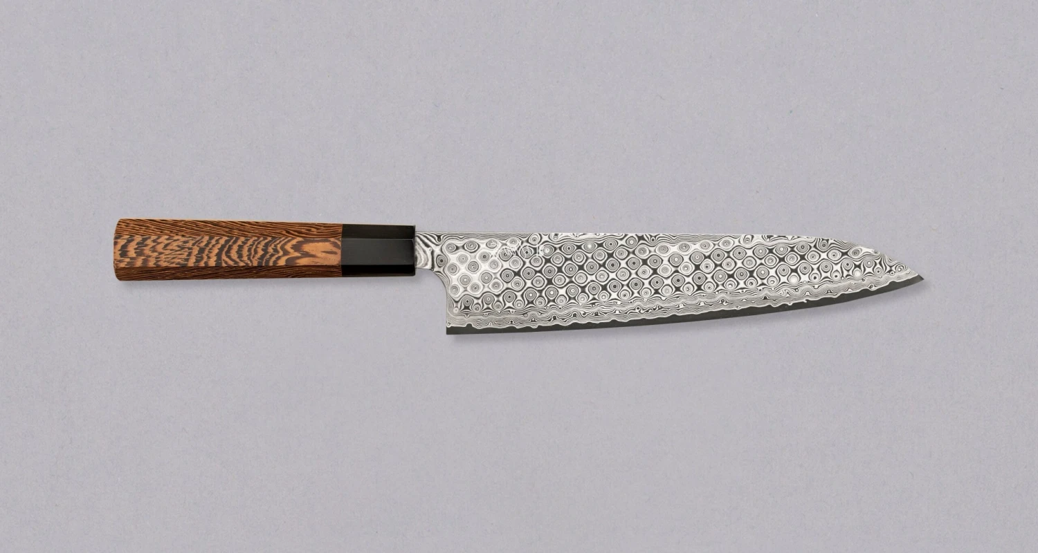 Gyuto is the most versatile and useful blade shape in the modern kitchen. It has a wide profile for easy food transfer and tends to be fairly flat towards the heel, enabling easy and fast chopping on the cutting board. A pointed tip allows piercing and precise, delicate work. A slight curve between the tip and the midsection makes the belly great for rocking the blade back and forth when cutting. It can be used for cutting meat, fish and vegetables.