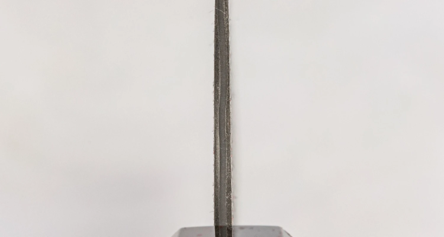 A high hardness of around 64 HRC means that the blade won’t be very tough, so the blade’s core was laminated using the san-mai method to improve its structural integrity and subsequent ability to withstand impacts and prevent chipping. San-mai translates to “three layers” in Japanese, referring to a blade that is composed of a primary, inner layer of harder steel (hagane) and of two secondary, outer layers of softer steel (jigane) that protect the prior.
