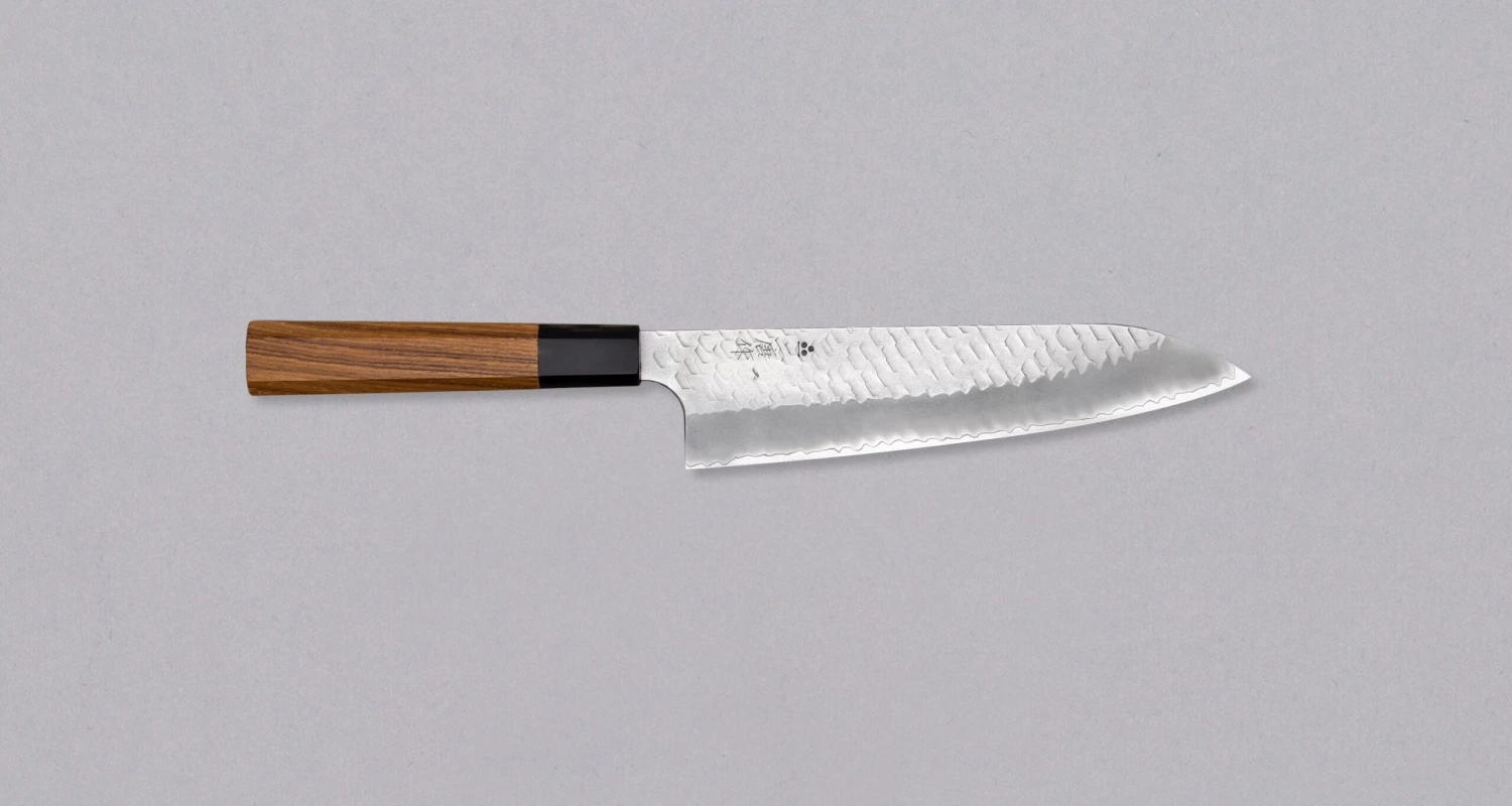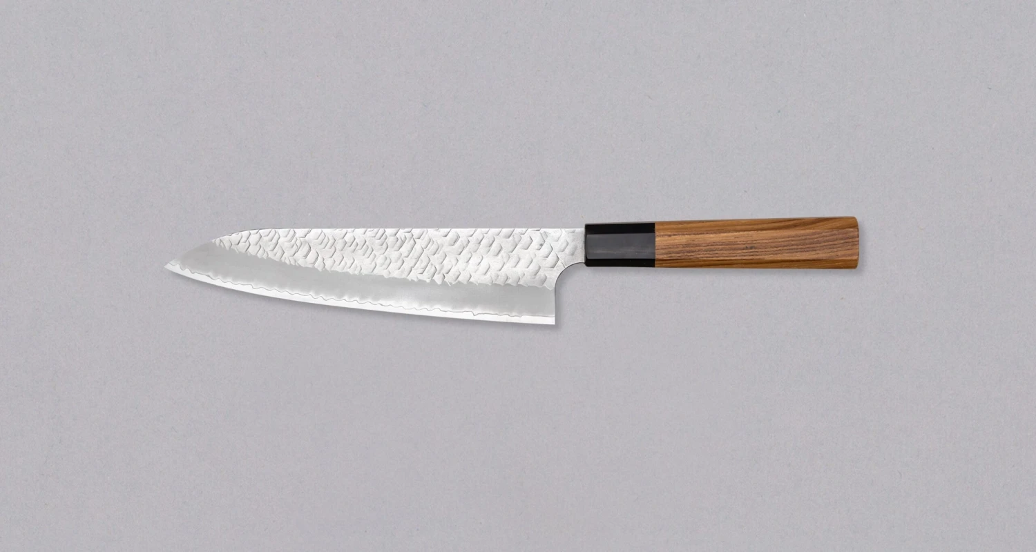 Gyuto is the most versatile and useful blade shape in the modern kitchen. It has a wide profile for easy food transfer and tends to be fairly flat towards the heel, enabling easy and fast chopping on the cutting board. A pointed tip allows piercing and precise, delicate work. A slight curve between the tip and the midsection makes the belly great for rocking the blade back and forth when cutting. It can be used for cutting meat, fish and vegetables.
