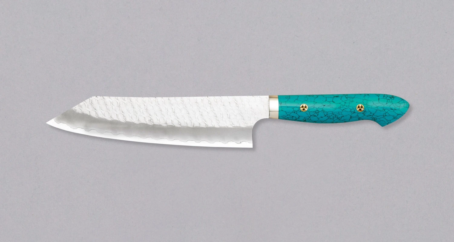 Nigara Kiri-Gyuto SG2 Migaki Tsuchime Turquoise 210mm (8.3″) is a multi-purpose Japanese kitchen knife, suitable for preparing meat, fish, and vegetables. Its SG2 powder steel core ensures long-lasting sharpness with little to no maintenance, as the steel resists corrosion very well. Its striking blade features and aesthetics are wonderfully complemented by a stunning Western-style turquoise handle made from turquoise stone powder and fiberglass. Each handle showcases captivating patterns in vivid color, making it a truly unique addition to your kitchen arsenal.
