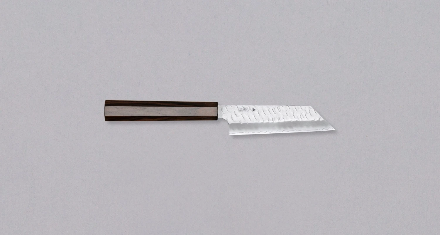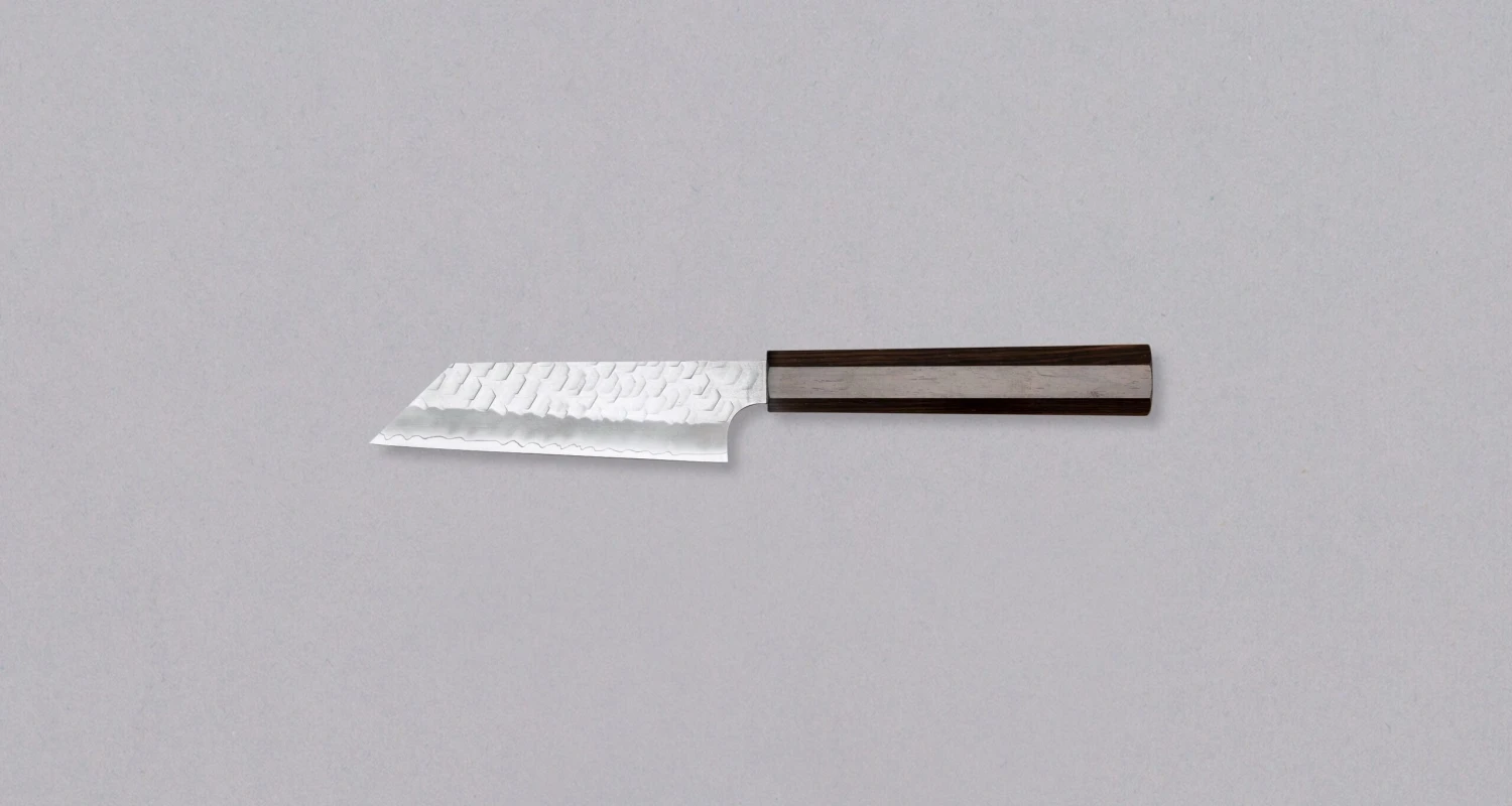 Nigara Kiri-Petty SG2 Migaki Tsuchime Wa Ebony 120mm is a small Japanese kitchen knife, intended for all those smaller tasks where larger and wider knives are deemed unwieldy. Aside from excelling at usual tasks, such as peeling, paring and other in-hand cutting, you can use it for some heavier work as well. Light butchering, poultry deboning and fish filleting are completely within its reach (🚨 Just keep in mind that it’s still an extremely hard knife, so cutting through bones and joints is out of the question!). The pronounced “K-tip” proves very useful with fine, decorative work with vegetables and fruit, as well as with trimming and skinning, as it’s great for piercing through the skin.