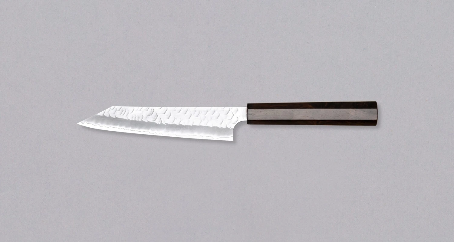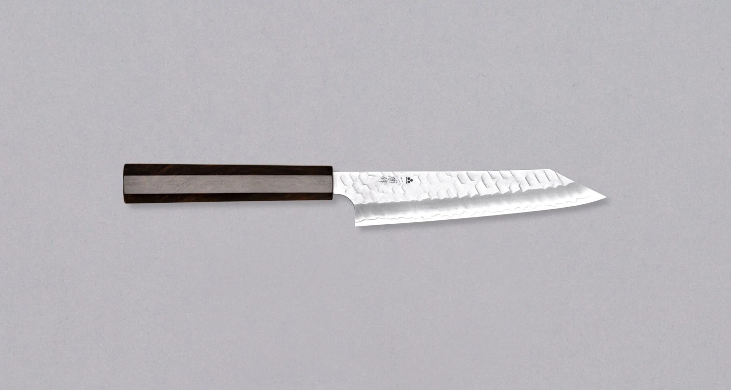 Nigara Kiri-Petty SG2 Migaki Tsuchime Wa Ebony 150mm is a small Japanese kitchen knife, intended for all those smaller tasks where larger and wider knives are deemed unwieldy. Aside from excelling at usual tasks, such as peeling, paring and other in-hand cutting, you can use it for some heavier work as well. Light butchering, poultry deboning and fish filleting are completely within its reach (🚨 Just keep in mind that it’s still an extremely hard knife, so cutting through bones and joints is out of the question!). The pronounced “K-tip” proves very useful with fine, decorative work with vegetables and fruit, as well as with trimming and skinning, as it’s great for piercing through the skin.
