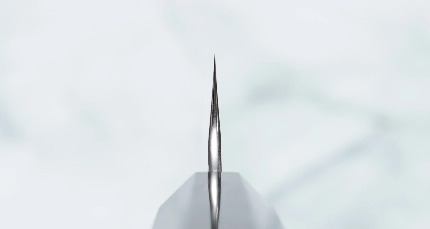 It has a double bevel (symmetrical) blade with convex (full hamaguri) grind. Hamaguri grind allows superior sharpness that requires delicate handling and helps to prevent food from sticking to the blade. Such a shape keeps a lot of metal behind the edge and makes for a stronger edge, yet it still allows a good degree of sharpness. The downside to a convex grind is that it is very hard to reproduce by anyone other than a very experienced sharpener.