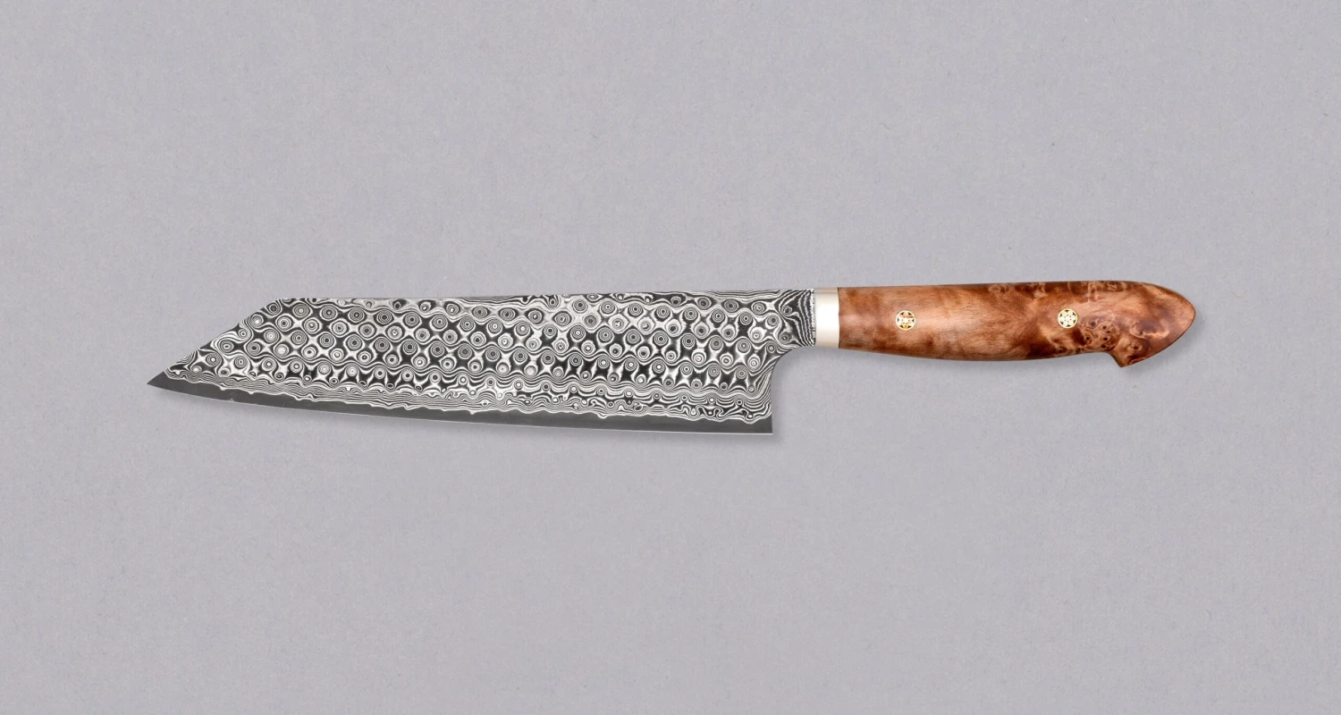 Kiritsuke is a multi-purpose blade shape, characterized by a long, flat blade and a special tip, also called a reverse tanto or kiritsuke tip (“K-tip” for short). The long blade will work great for preparing larger pieces of meat, slicing fish and chopping vegetables, while the tip can be utilized for intricate, precise work. Traditionally, kiritsuke knives were single-beveled, but have since often been reimagined as double-beveled multi-purpose knives to meet the demands of fast-paced tempos of modern kitchens. They were also only allowed to be used by the Executive Chef of the restaurant, but we’ll look away if you’re not (yet) the head chef. 😜
