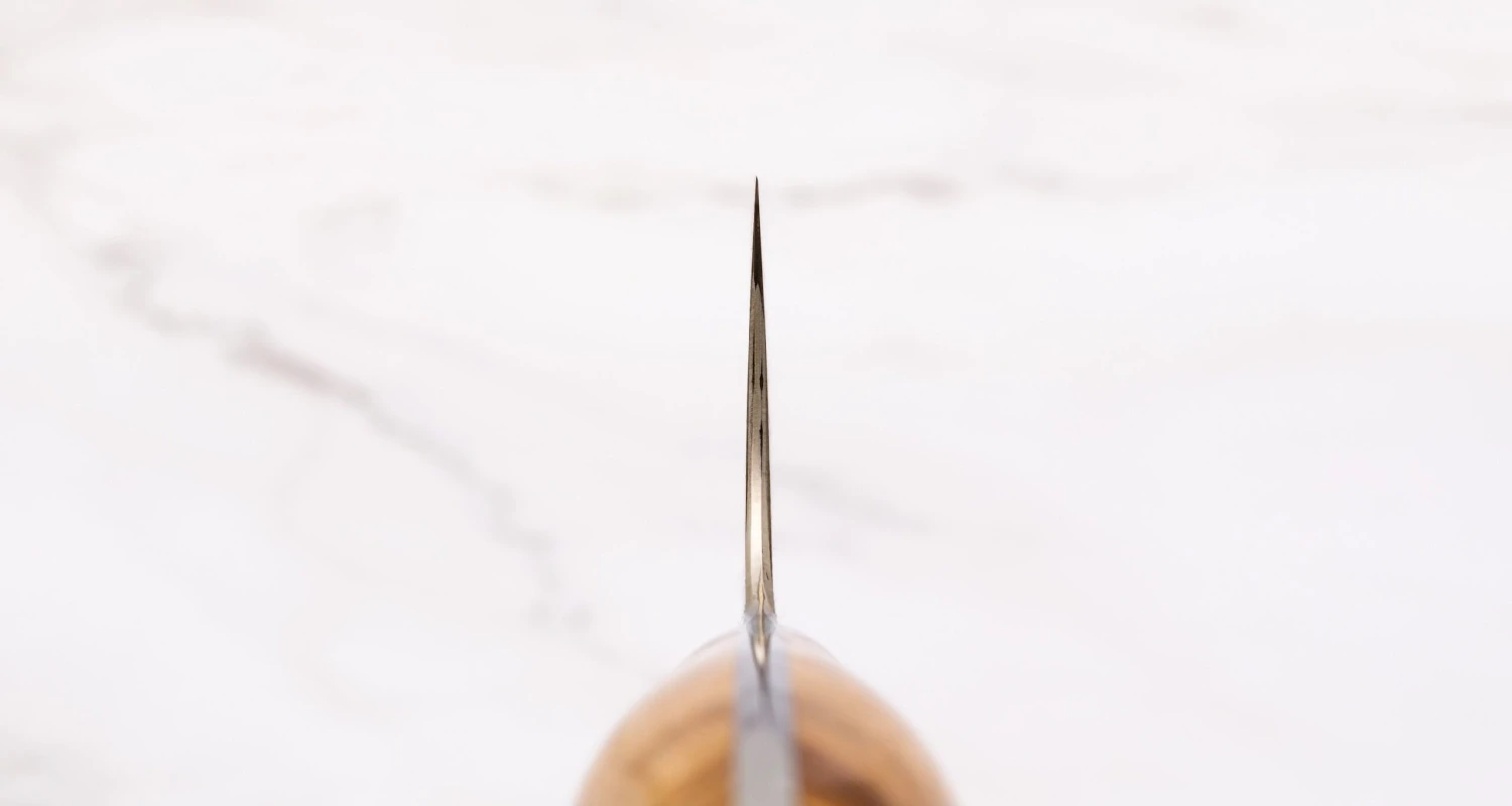 A high hardness of around 64 HRC means that the blade won’t be very tough, so the blade’s core was laminated using the san-mai method to improve its structural integrity and subsequent ability to withstand impacts and prevent chipping. San-mai translates to “three layers” in Japanese, referring to a blade that is composed of a primary, inner layer of harder steel (hagane) and of two secondary, outer layers of softer steel (jigane) that protect the prior.