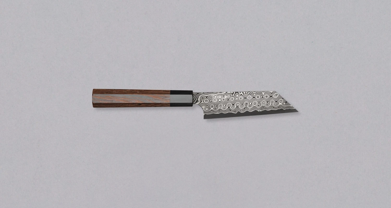 Nigara Kiritsuke Petty SG2 Damascus 120mm (4.7″) is a small Japanese kitchen knife, intended for all those smaller tasks where larger and wider knives are deemed unwieldy. Aside from excelling at usual tasks, such as peeling, paring and other in-hand cutting, you can use it for some heavier work as well. Light butchering, poultry deboning, and fish filleting are completely within its reach (๐จ Just keep in mind that it’s still an extremely hard knife, so cutting through bones and joints is out of the question!). The pronounced โK-tipโ proves very useful with fine, decorative work with vegetables and fruit, as well as with trimming and skinning, as itโs great for piercing through the skin.
