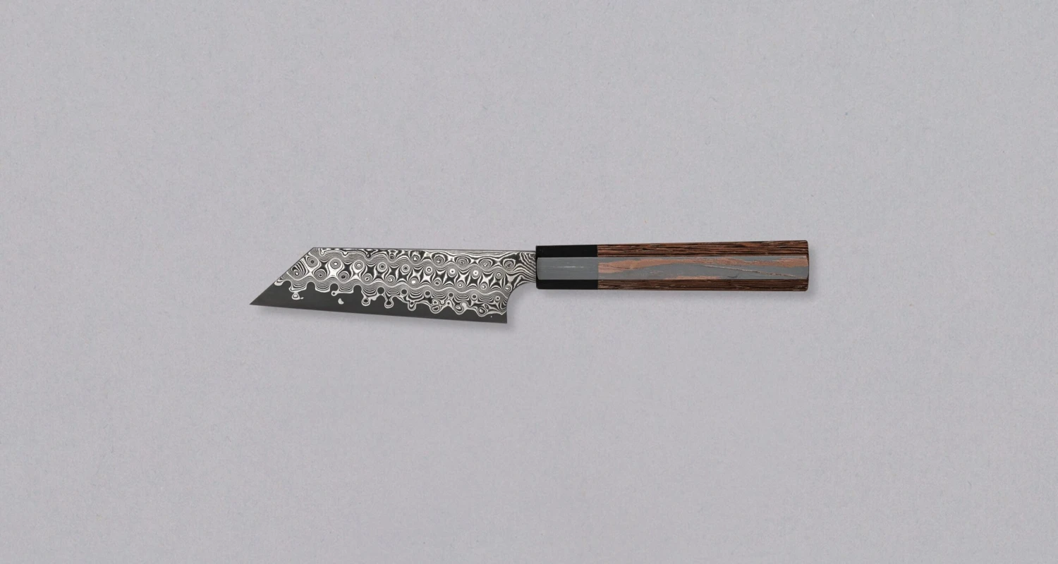The blade is adorned with a raindrop damascus pattern. This technique, also known as the Anmon design, is the work of the current head blacksmith of Nigara Hamono, Tsuyoshi Yoshizawa. The cutting edge of the knife has a forced patina to match the dark gray appearance of the blade.