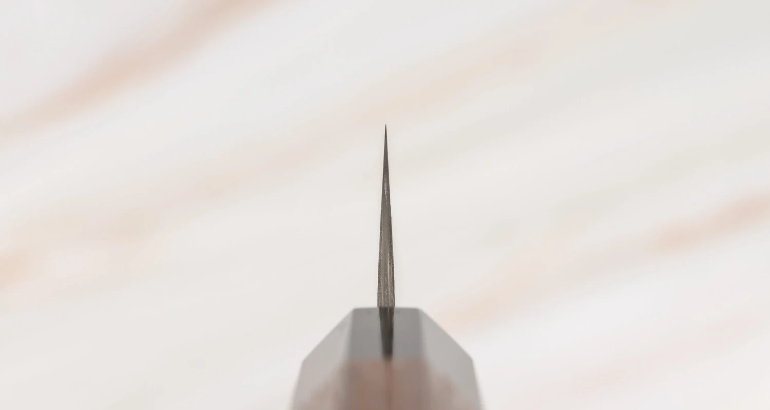 The blade has a distal taper – at the tang, the blade is 2.0mm (0.08″) thick and narrows towards the tip, where it is 1.6mm (0.06″) thick. This gives it more strength and weight at the handle (meaning we can exert more pressure with the heel) and more precision at the tip, allowing for smooth and precise cuts.