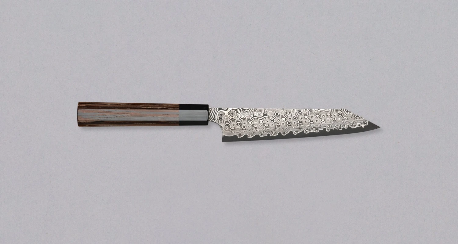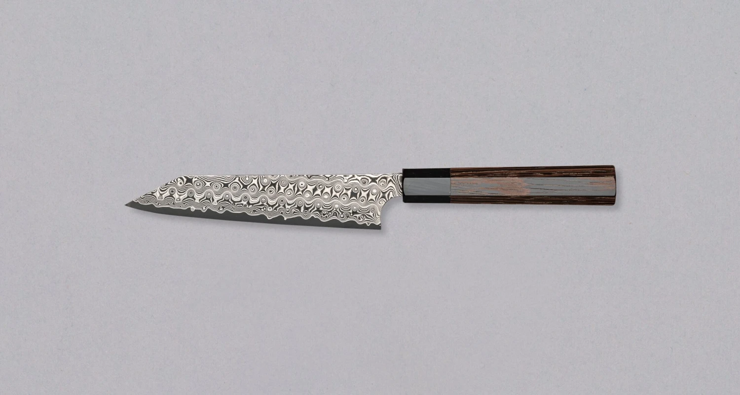 Petty knives are designed for smaller tasks on and off the cutting board. It’s an indispensable knife in any kitchen and can be used for peeling, mincing, paring, and decorating food. The blade ends in a “K-tip” tip, typical of Japanese swords and daggers. Petty or utility knives are basically a smaller version of gyutos or chef’s knives. Due to the length of the blade, it can also be used as a stand-alone knife if you are uncomfortable with longer blades. A must-have knife in every kitchen!